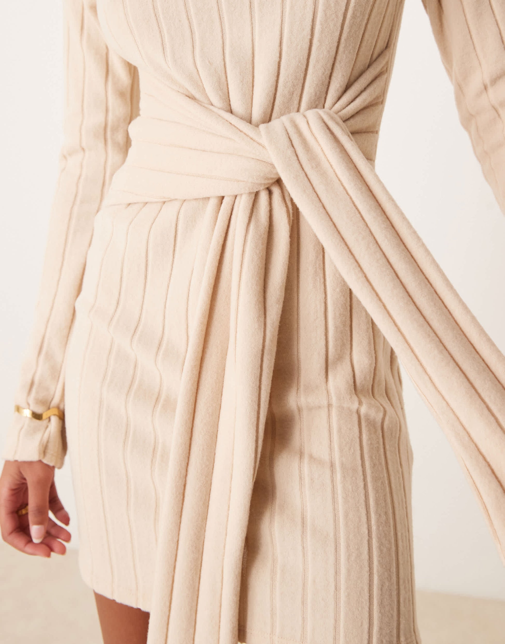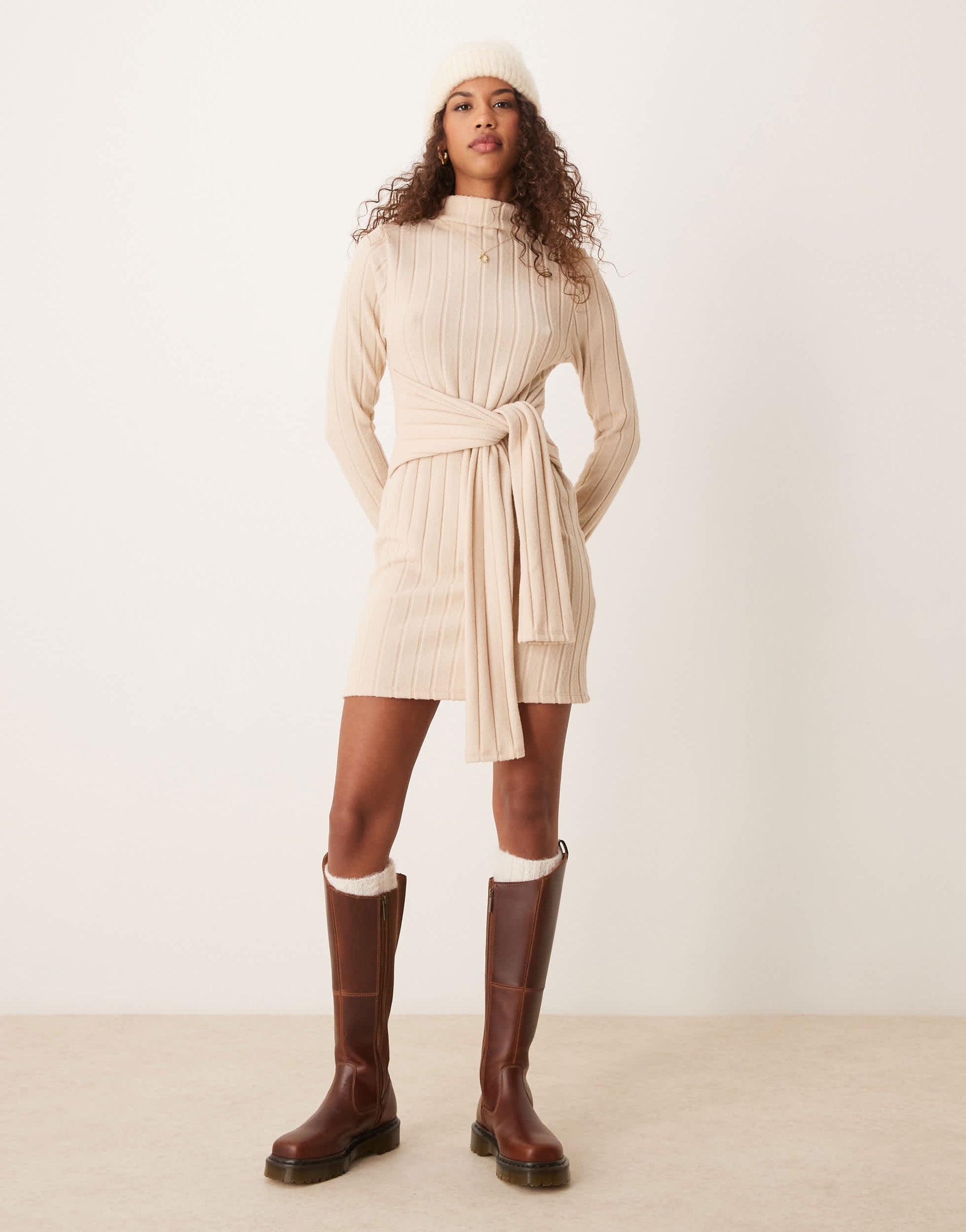 ASOS DESIGN chunky fluffy ribbed mini dress with wrap waist in cream