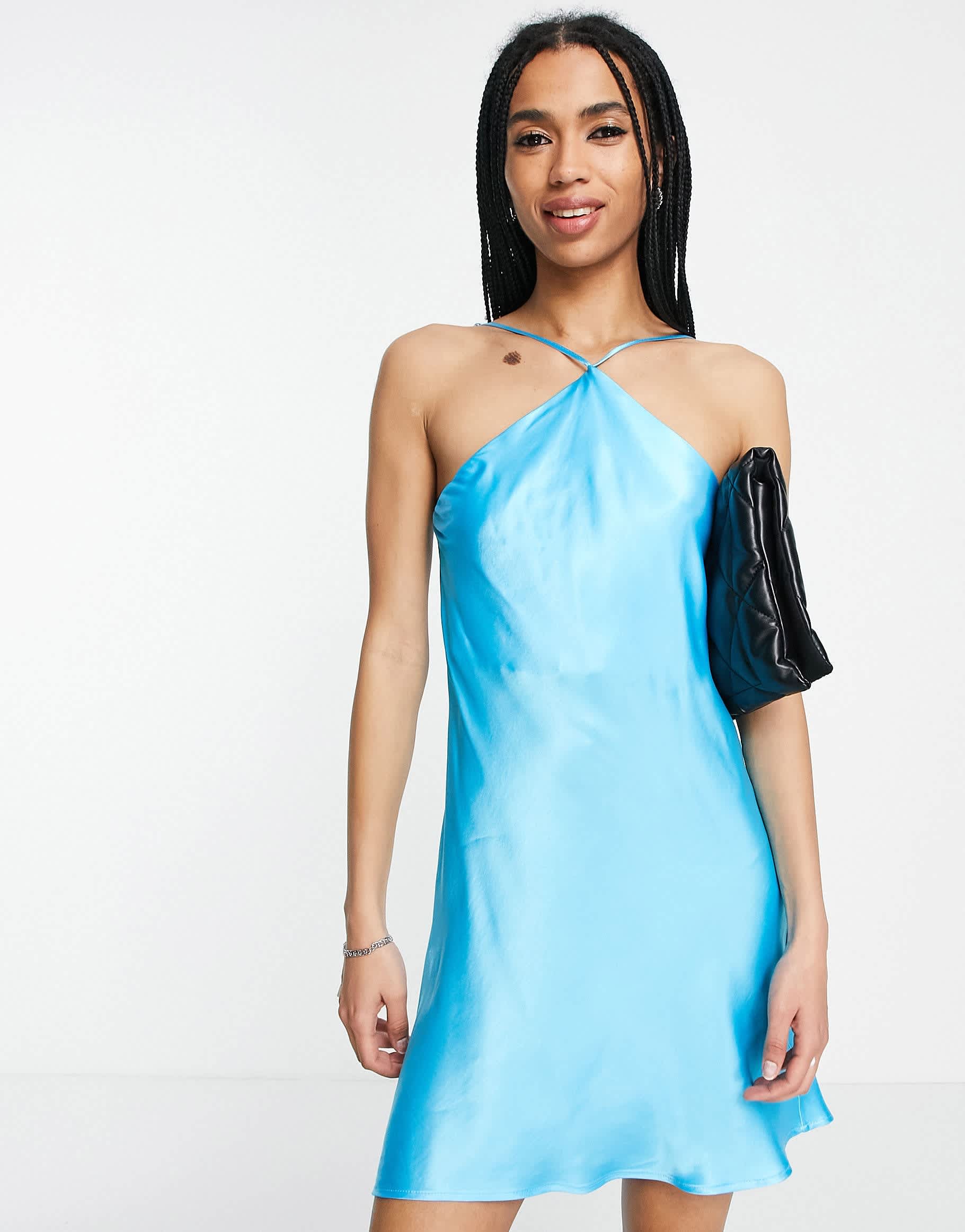 Bershka halterneck strap open back satin dress in soft blue