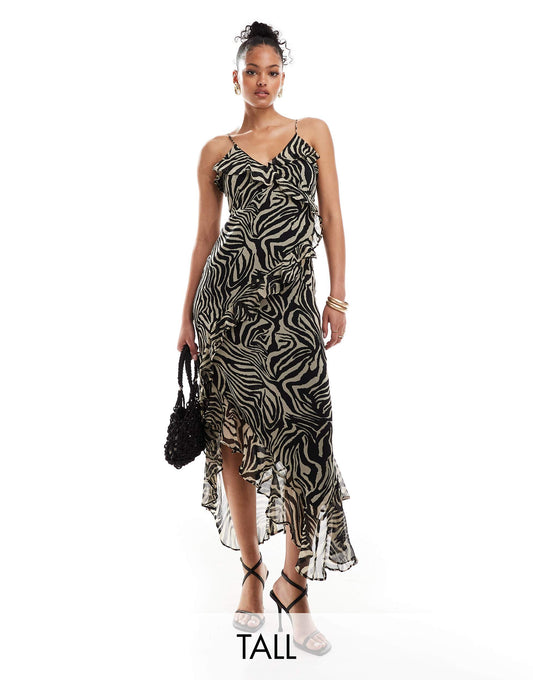 ASOS DESIGN bandeau extreme ruffle hem maxi dress with tie back in abstract print