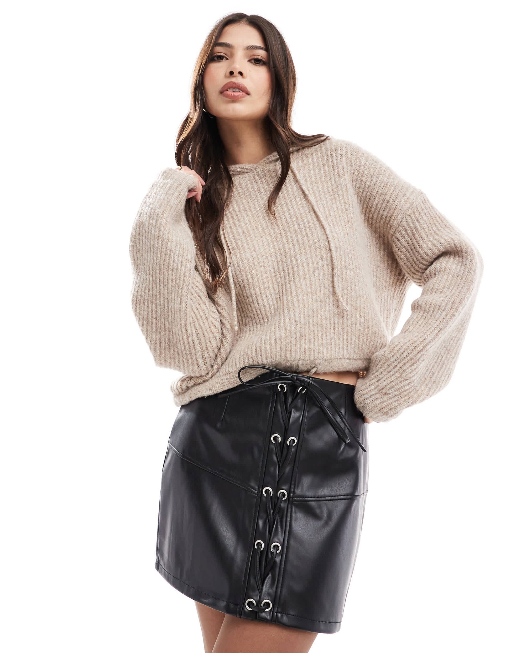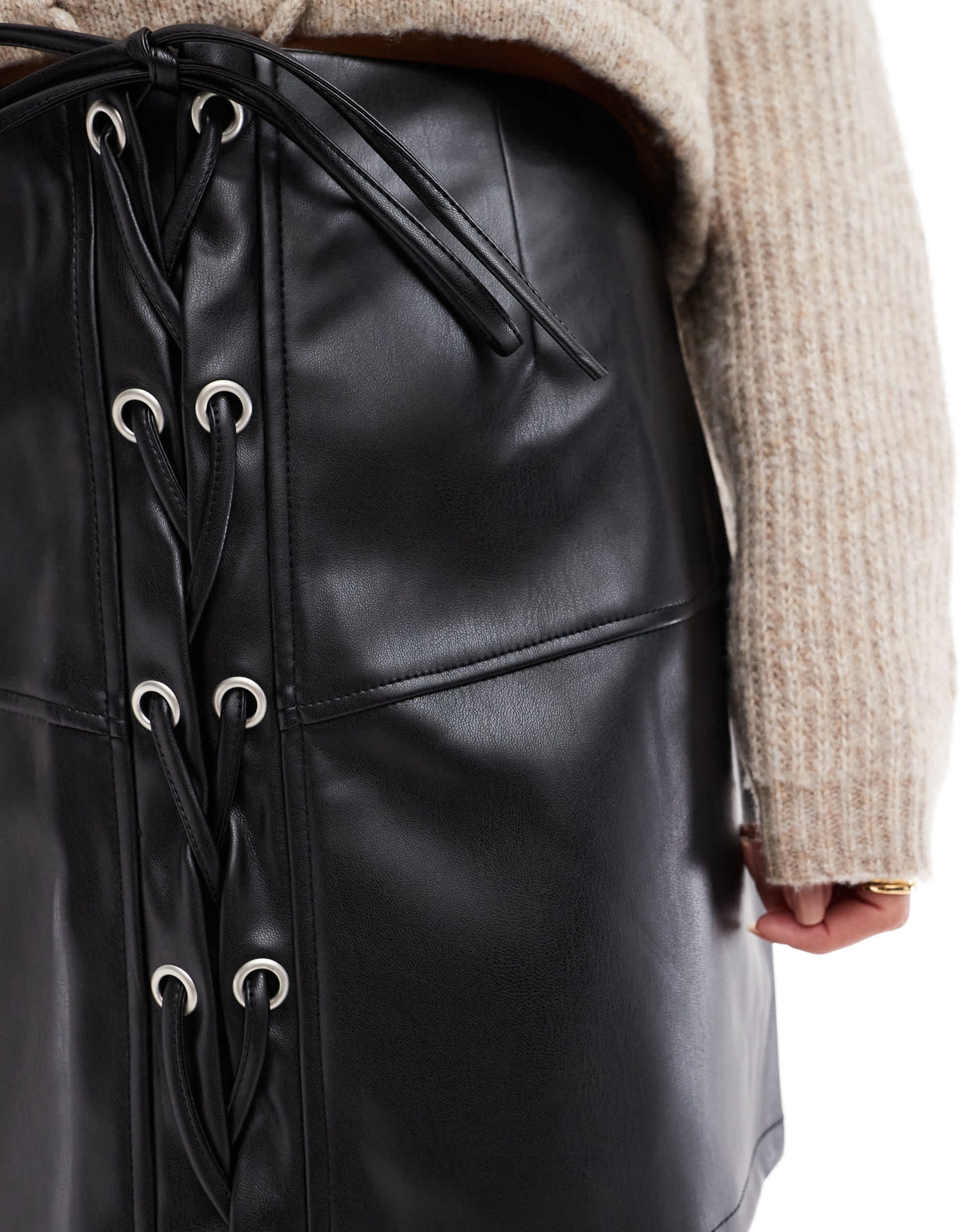 ASOS DESIGN lace up front leather look mini skirt in black