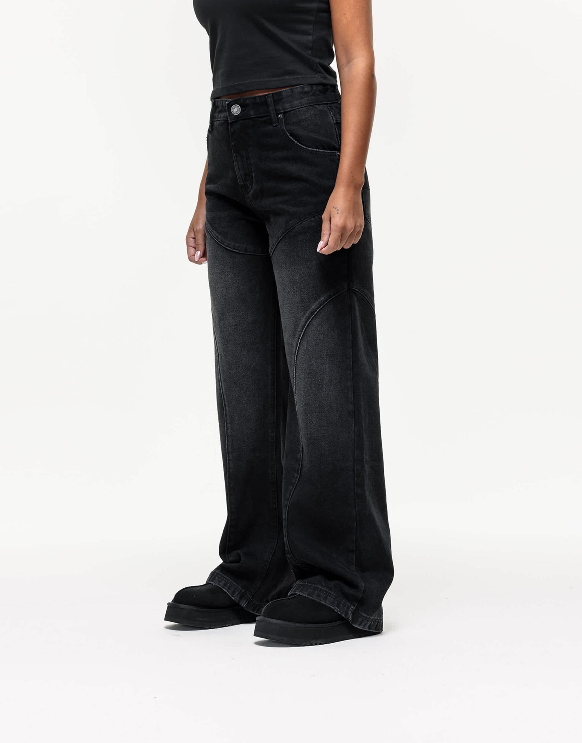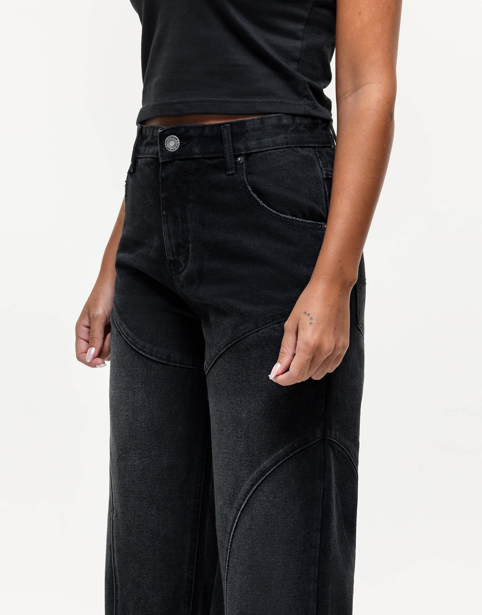 Non-stretch denim: black wash Main: 100% Cotton.