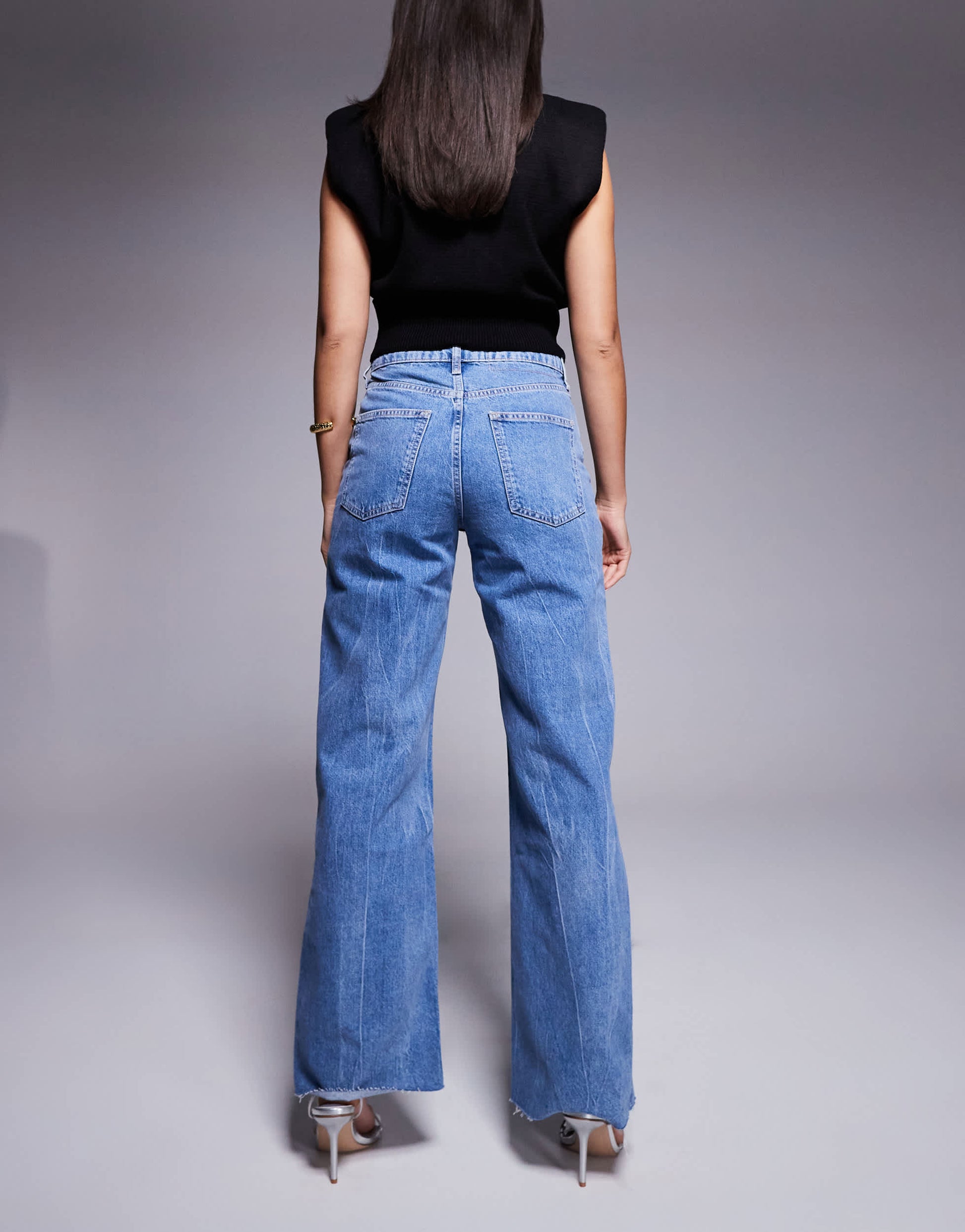 Non-stretch denim: mid-blue wash Main: 100% Cotton.