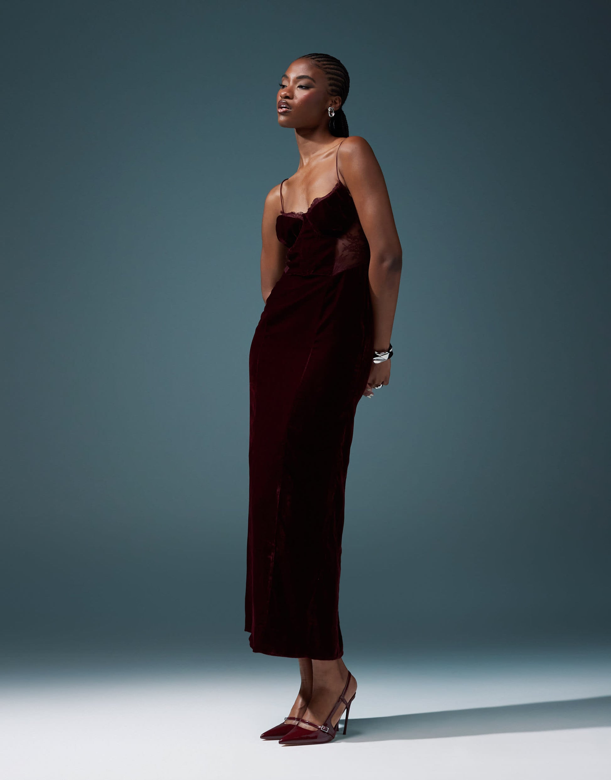 Velvet: plush, dense-pile fabric with a surface sheen Lace: 100% Nylon, Lining: 100% Polyester, Main: 100% Polyester.