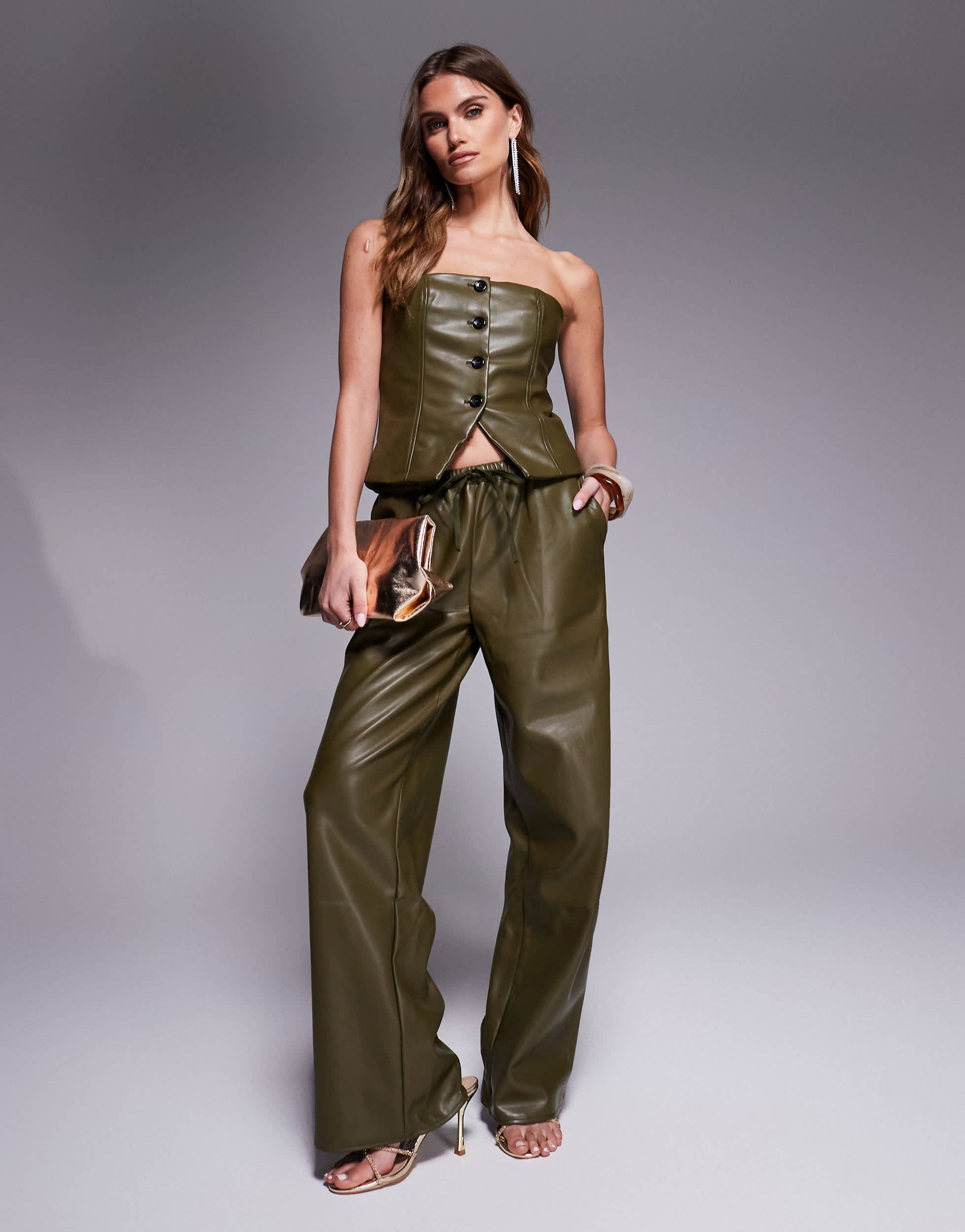 Kaiia exclusive leather look wide leg drawstring trousers co-ord in green