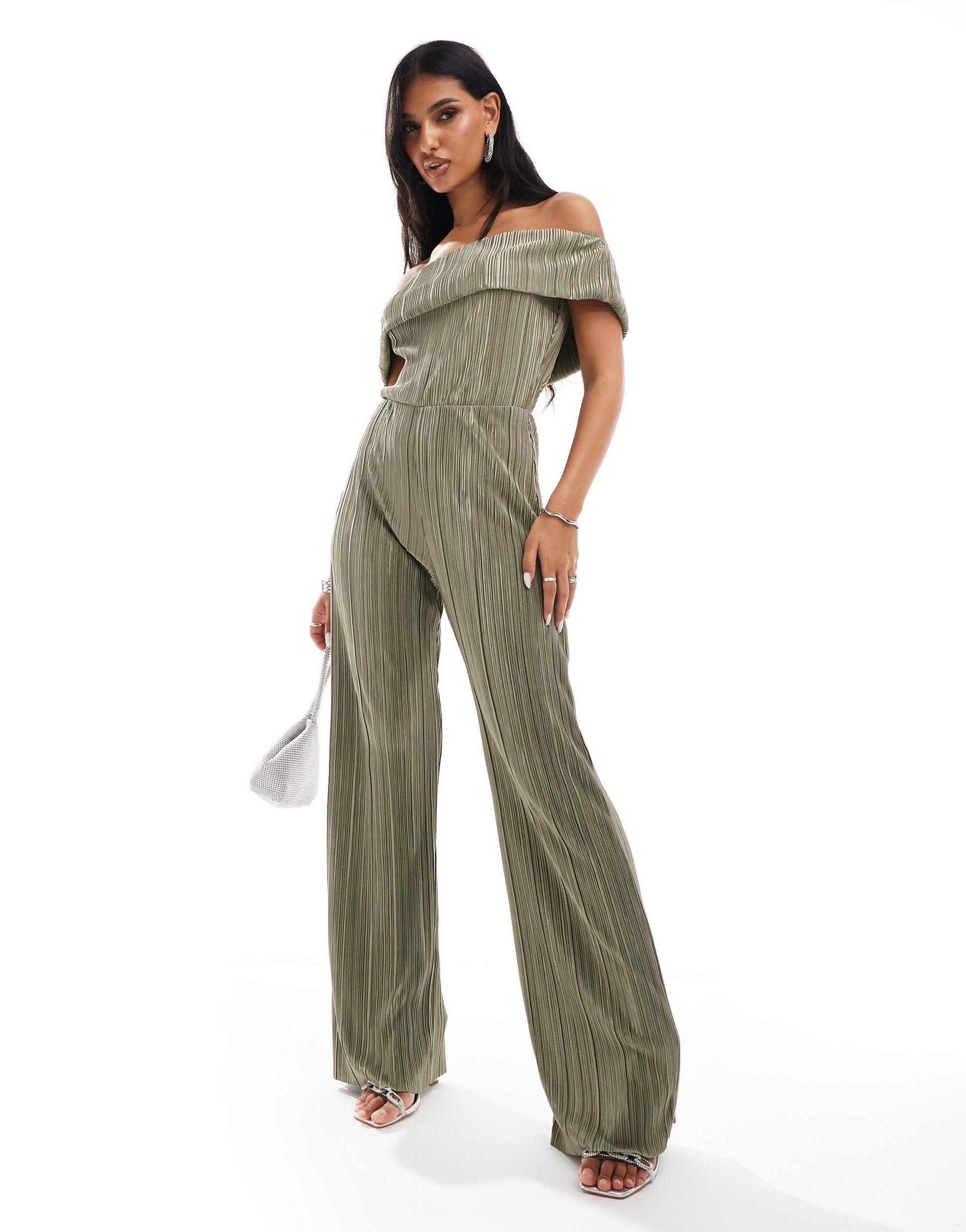 ASOS DESIGN plisse bardot wide leg jumpsuit in khaki
