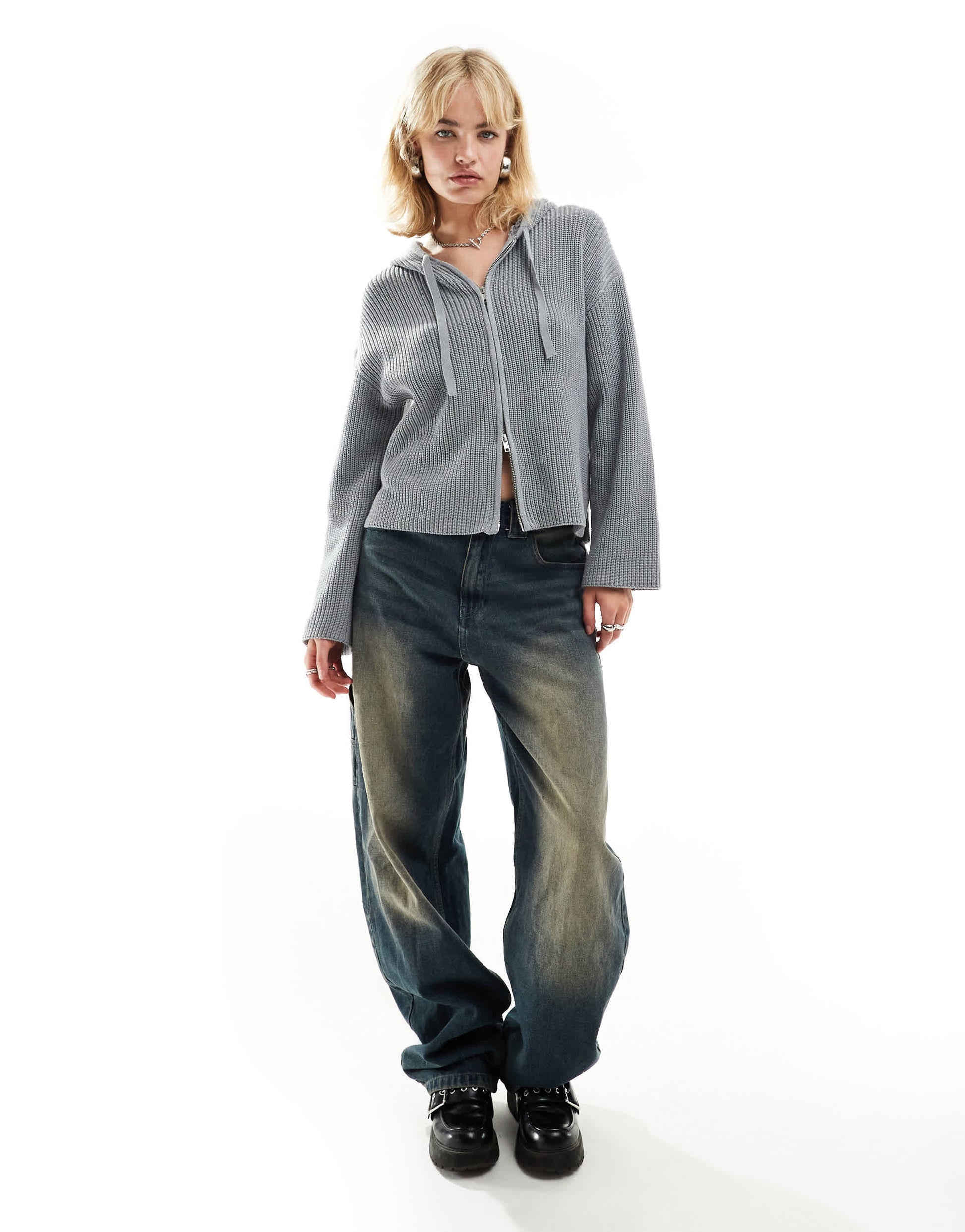 Monki knitted rib hoodie zip up cardigan in grey melange