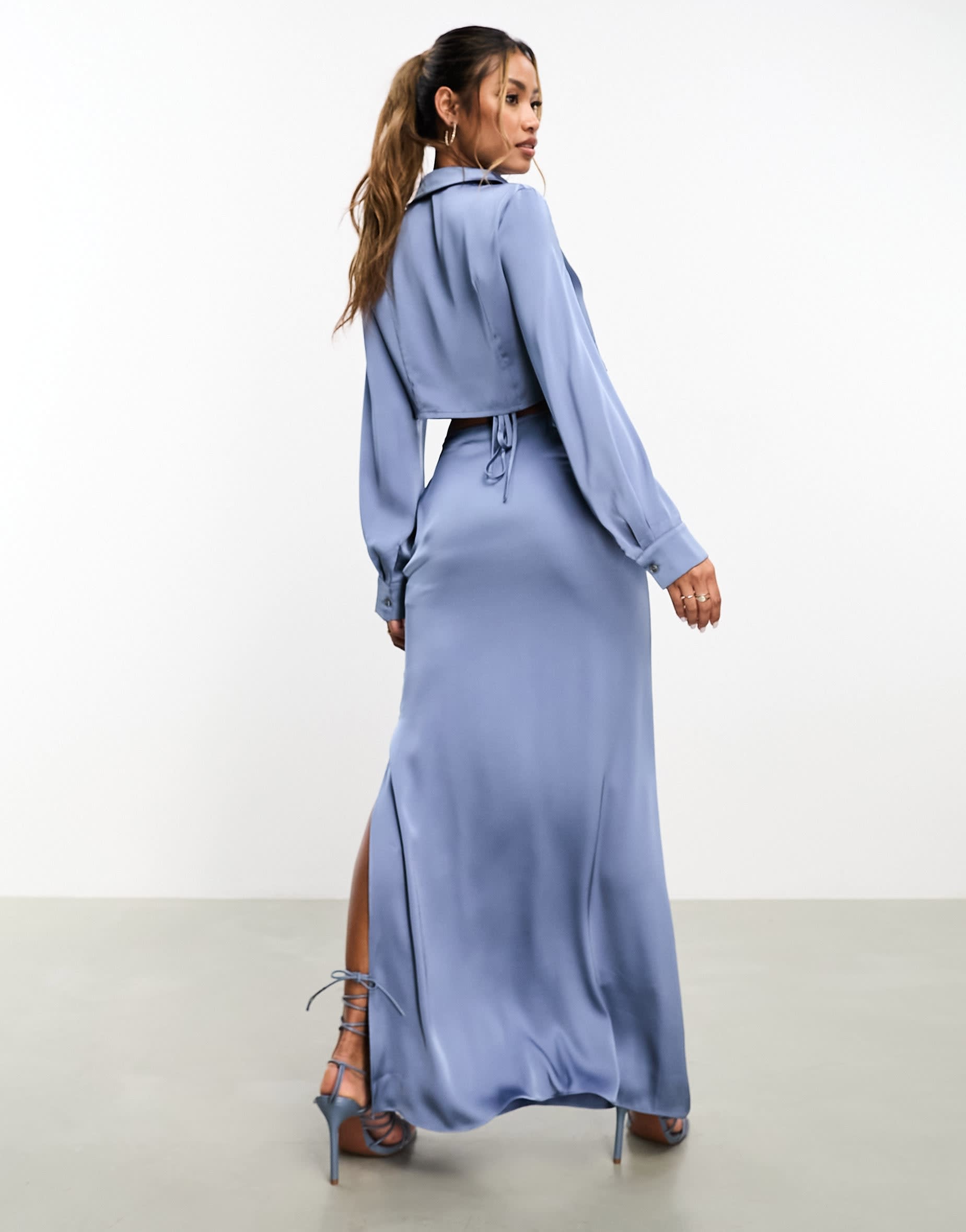 Aria Cove satin open tie side maxi skirt co-ord in blue