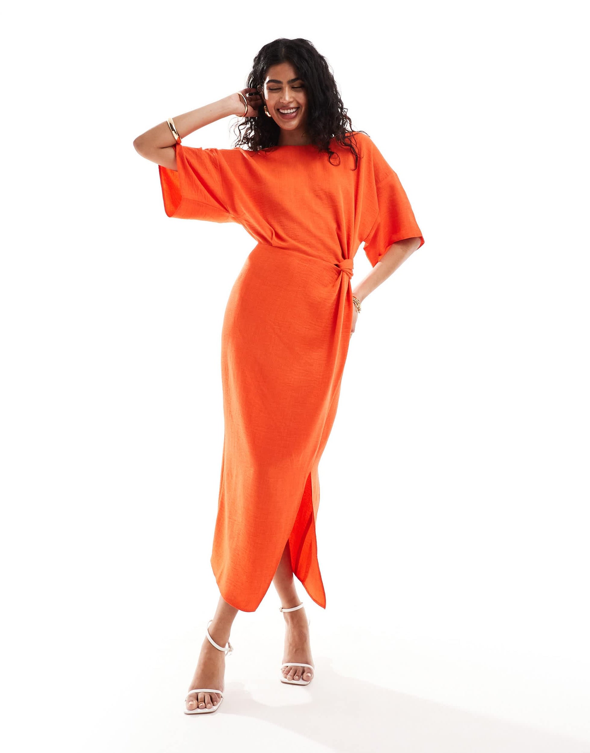 ASOS DESIGN angel sleeve drape waist tab detail midi dress in bright orange
