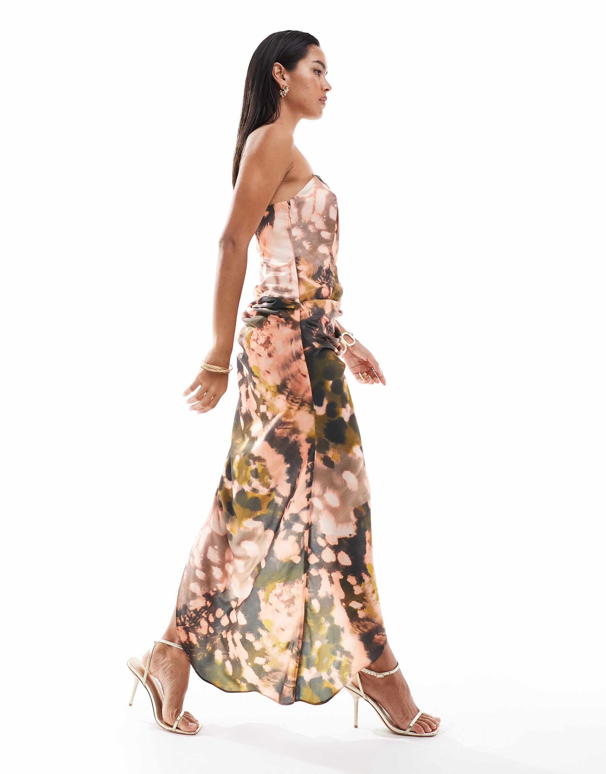 ASOS DESIGN bandeau draped skirt midi dress with thigh split in abstract print