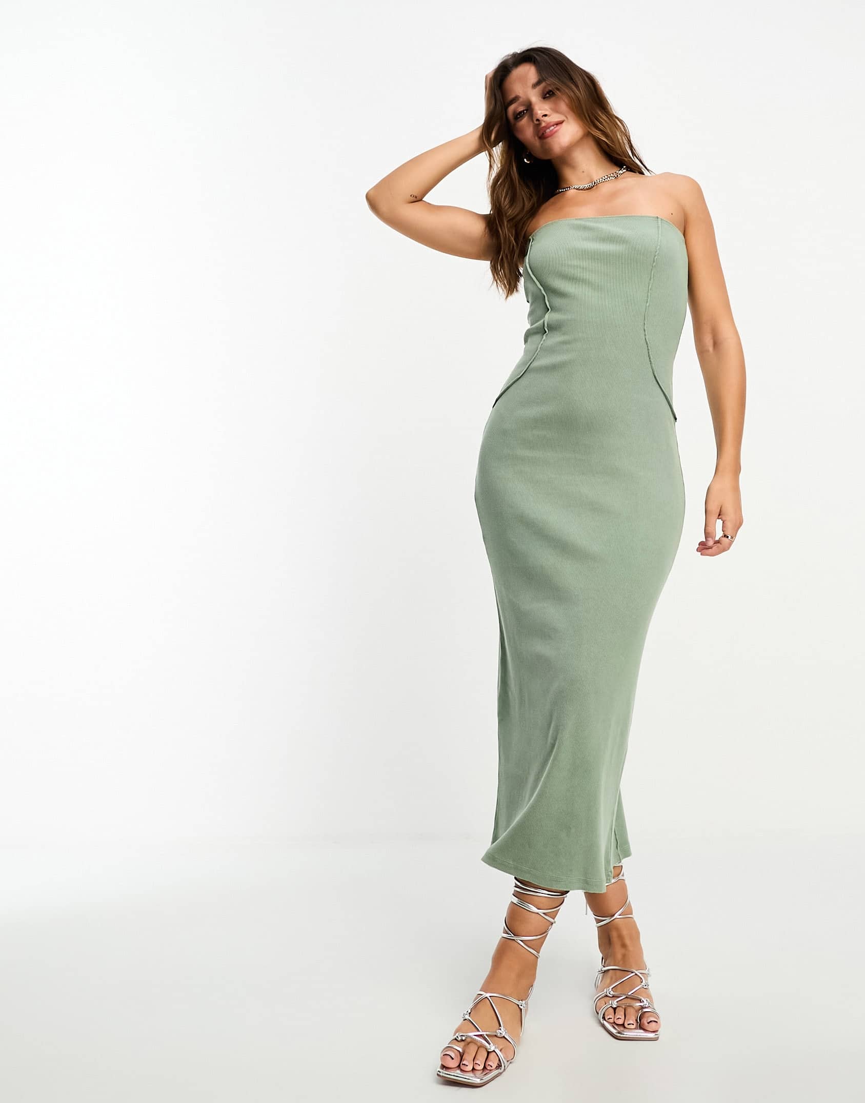 ASOS DESIGN bandeau midi dress with seam detail in washed khaki