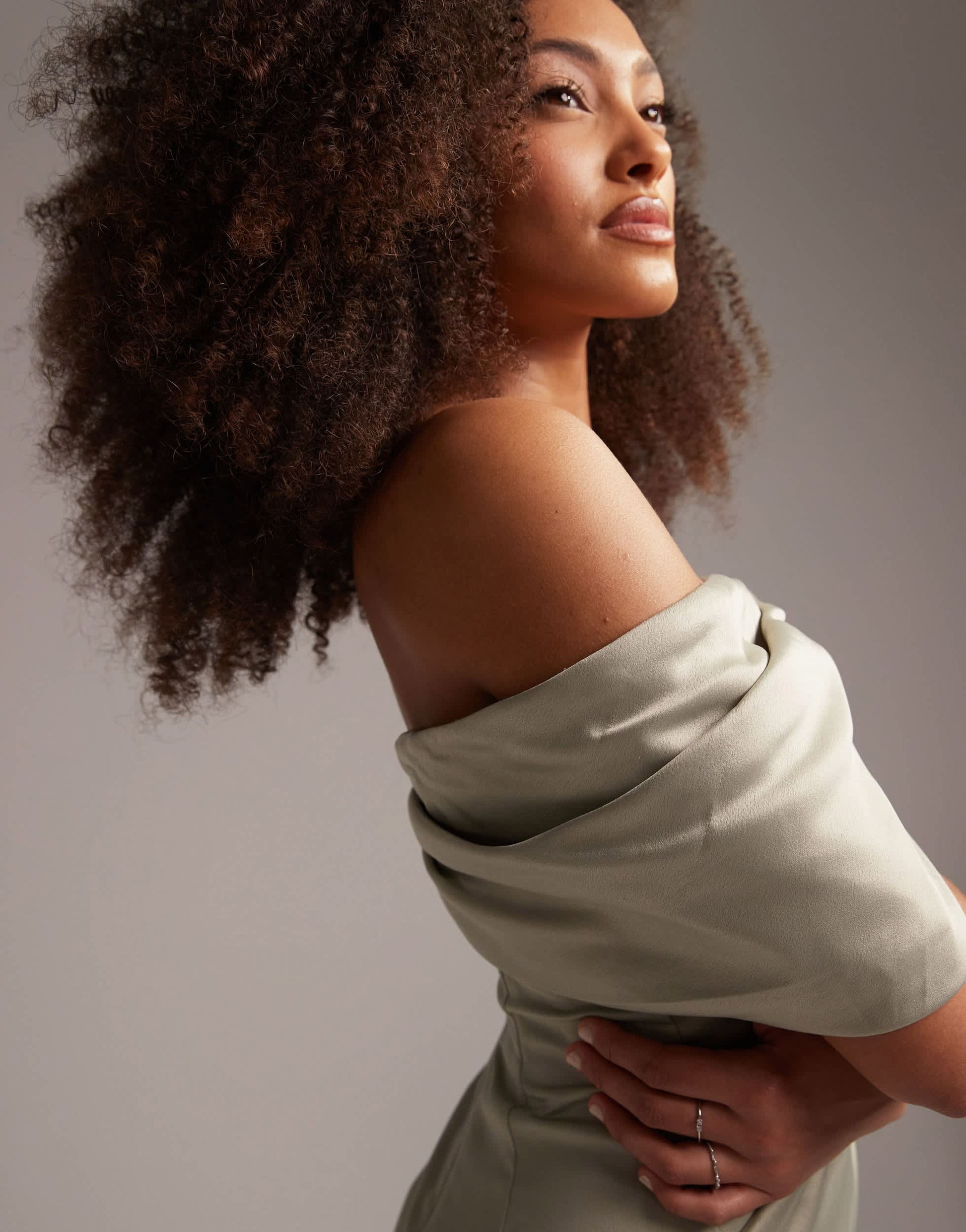 ASOS DESIGN Bridesmaid satin bardot drape wrap maxi dress in sage green