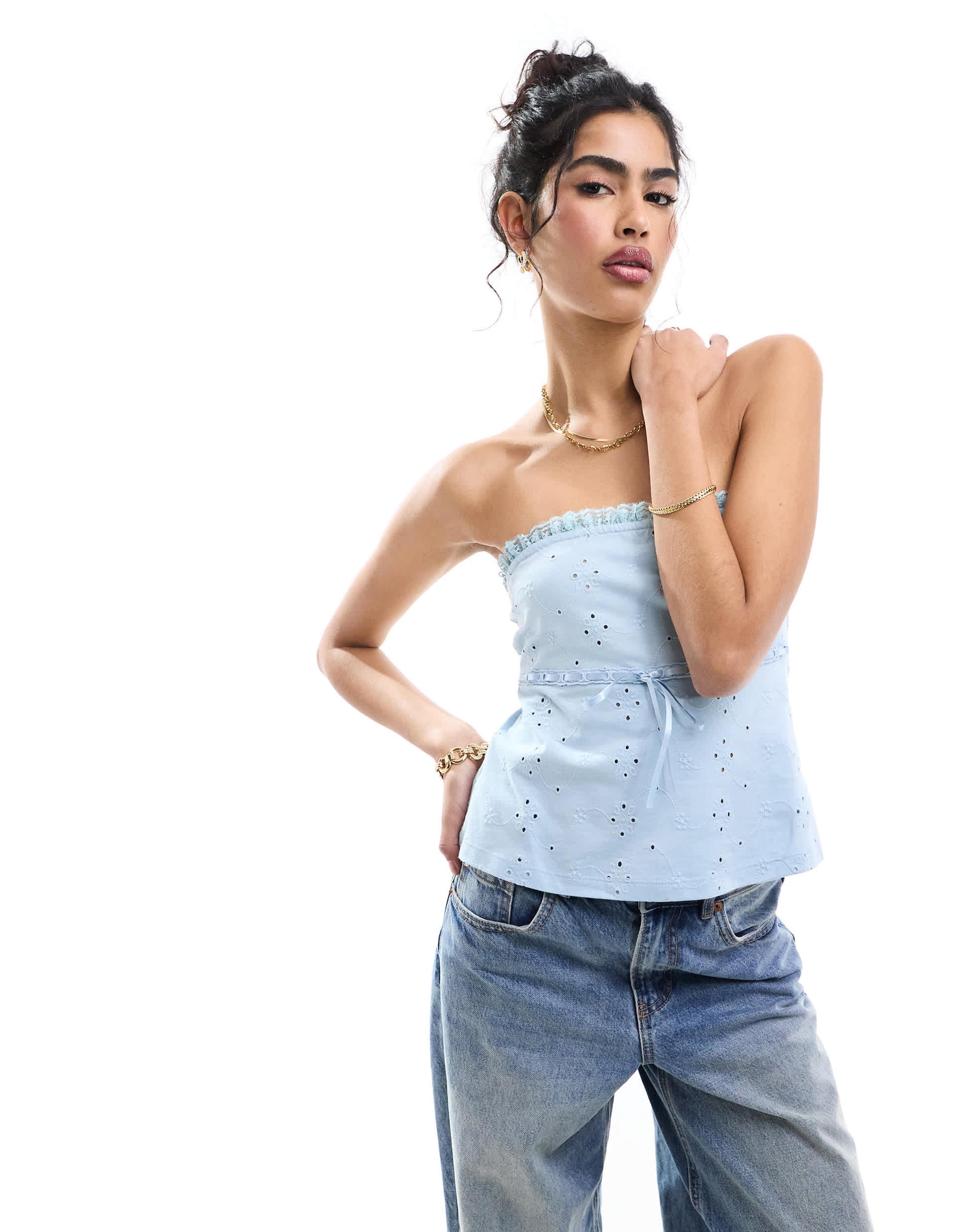 ASOS DESIGN broderie bandeau with ribbon detail in baby blue