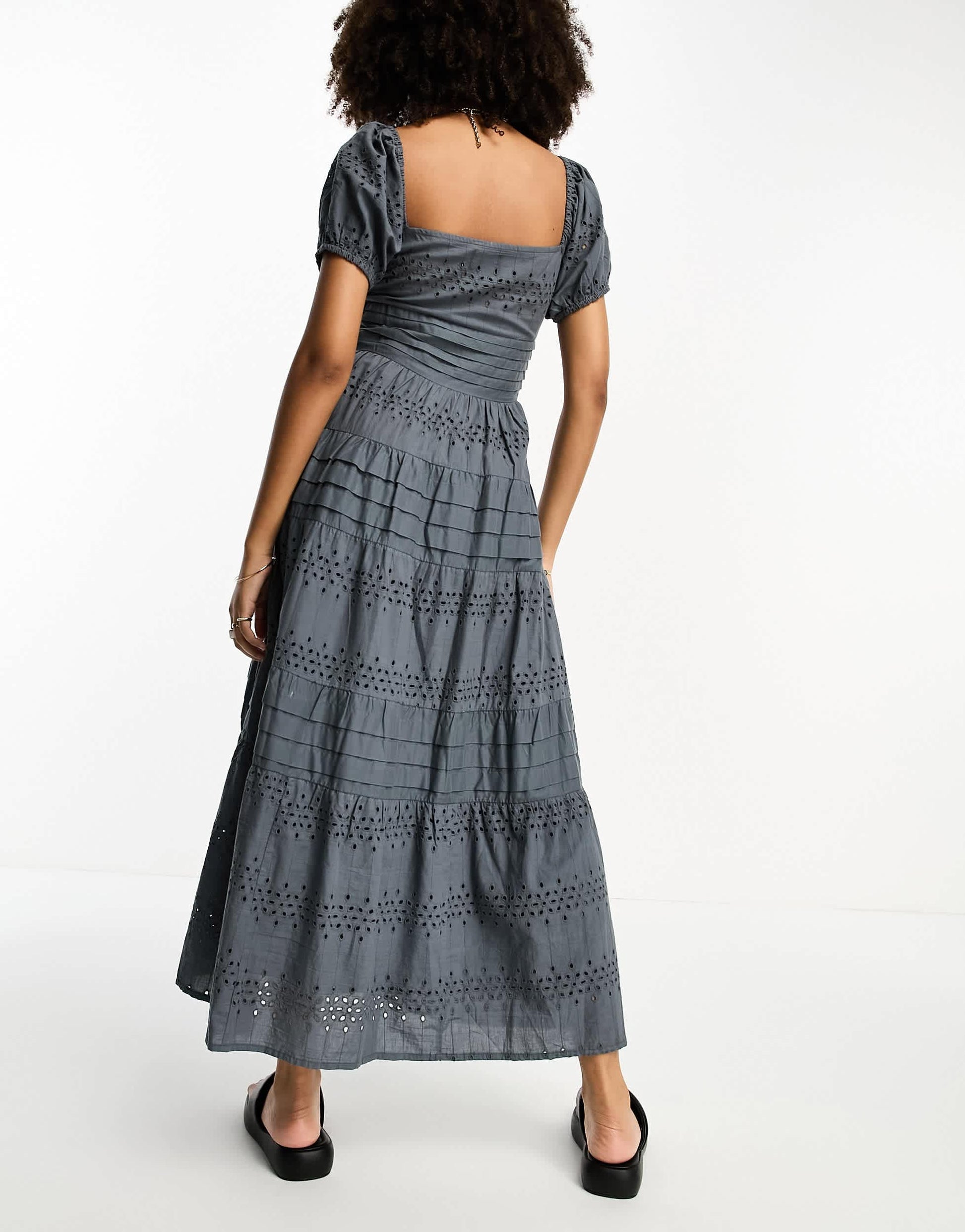 ASOS DESIGN broderie button through tiered maxi tea dress in slate grey