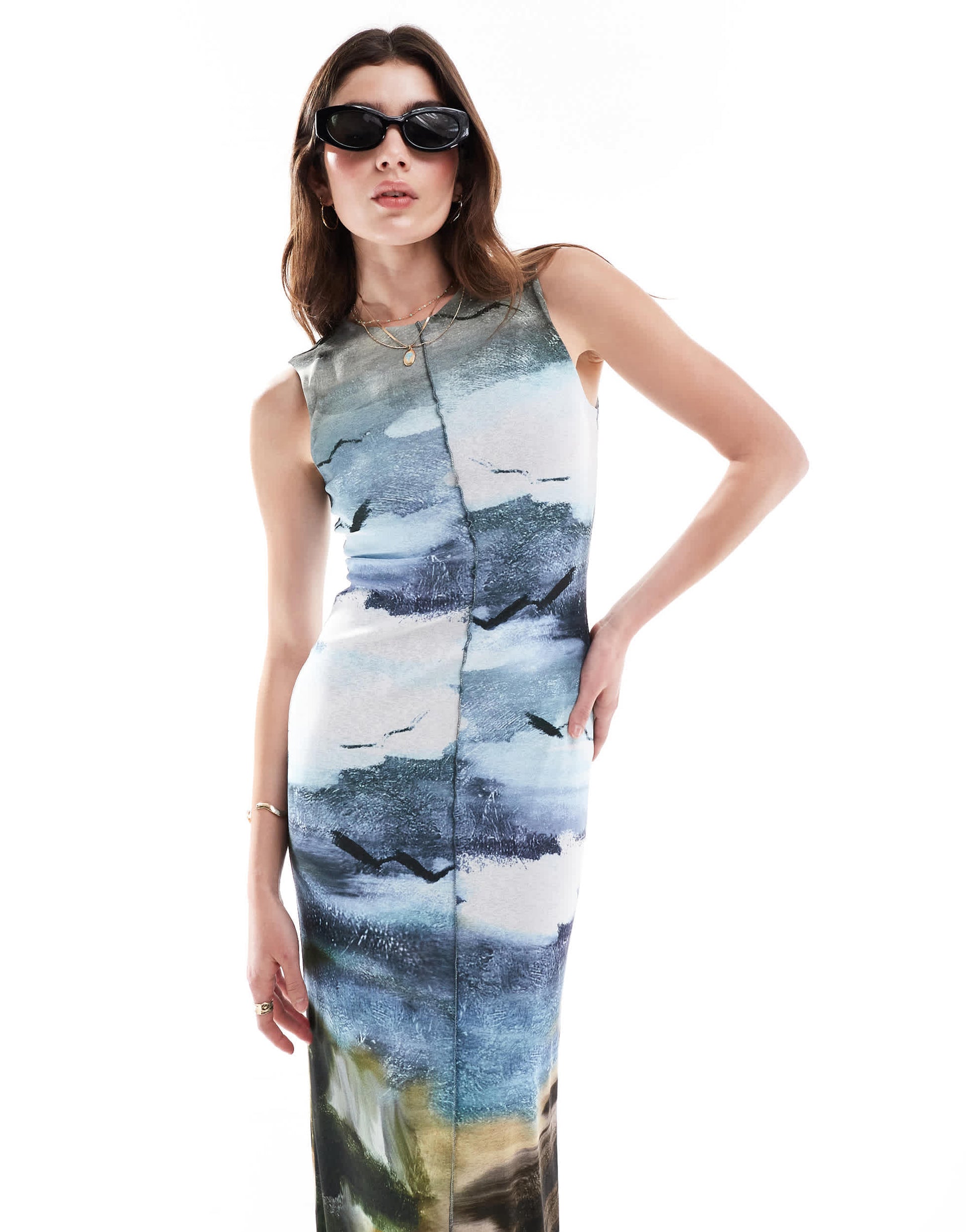 ASOS DESIGN built up mesh maxi dress with lettuce edging in landscape print