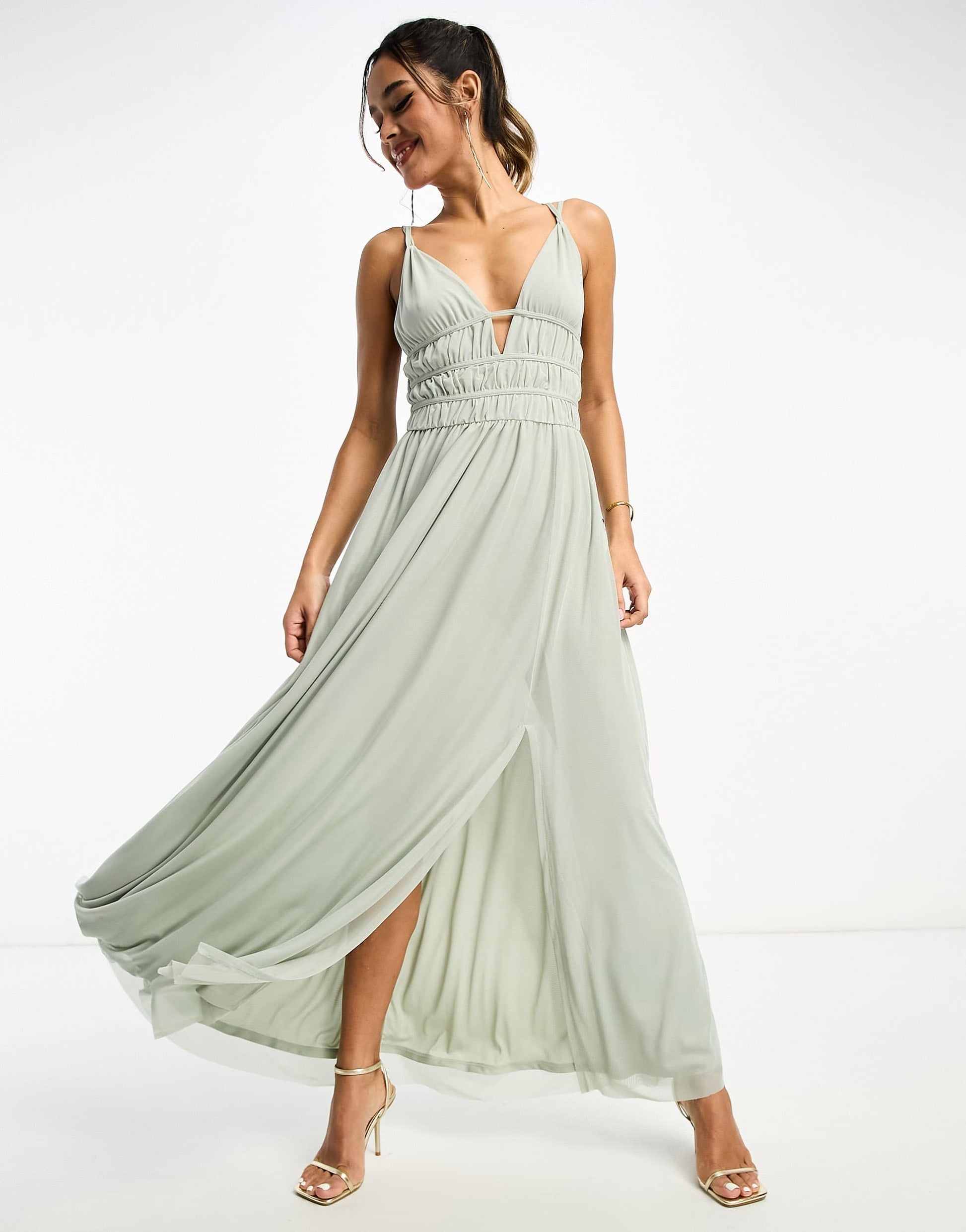 ASOS DESIGN cami ruched lace up back maxi dress in sage green