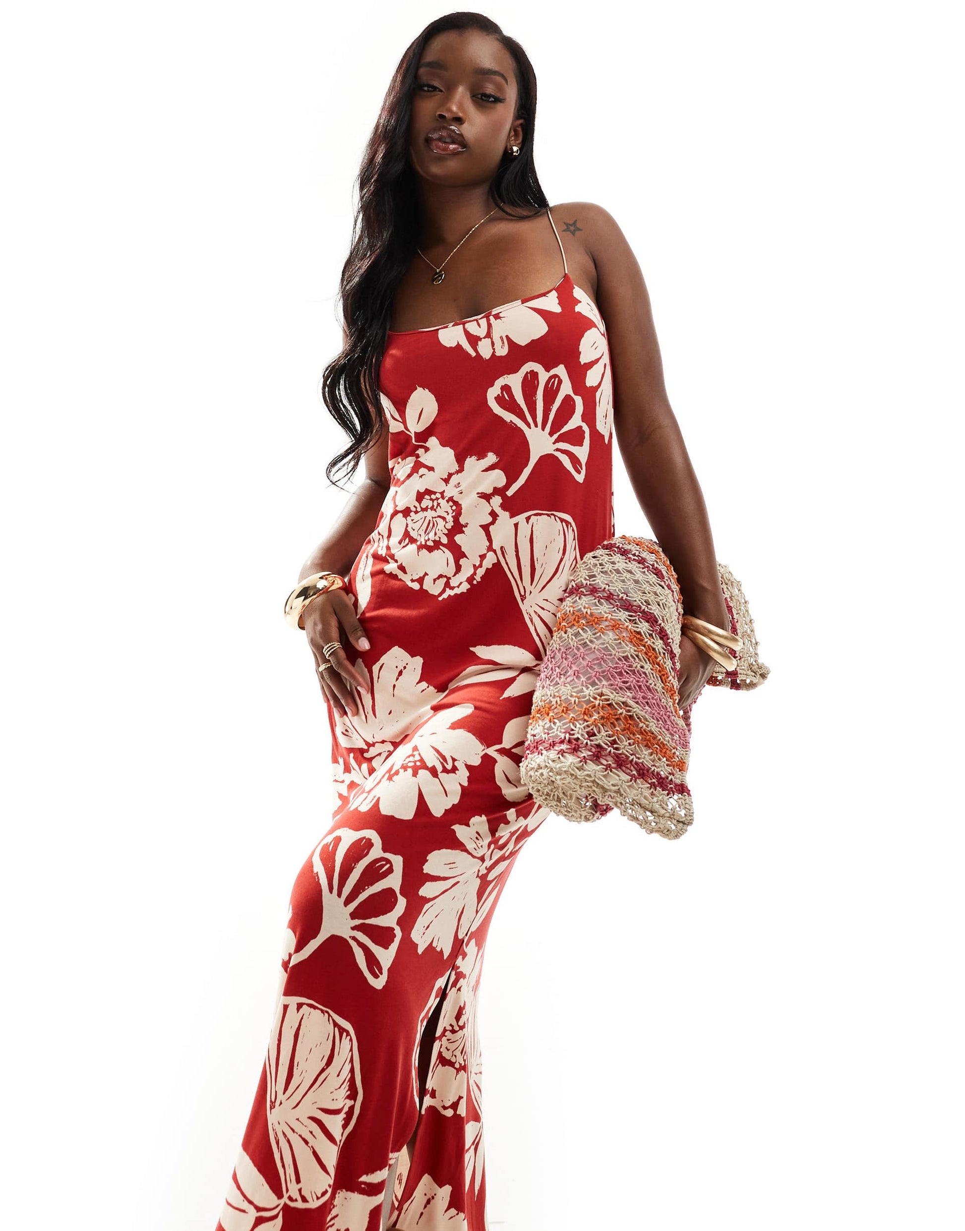 ASOS DESIGN cami strappy maxi dress with side split in red floral print
