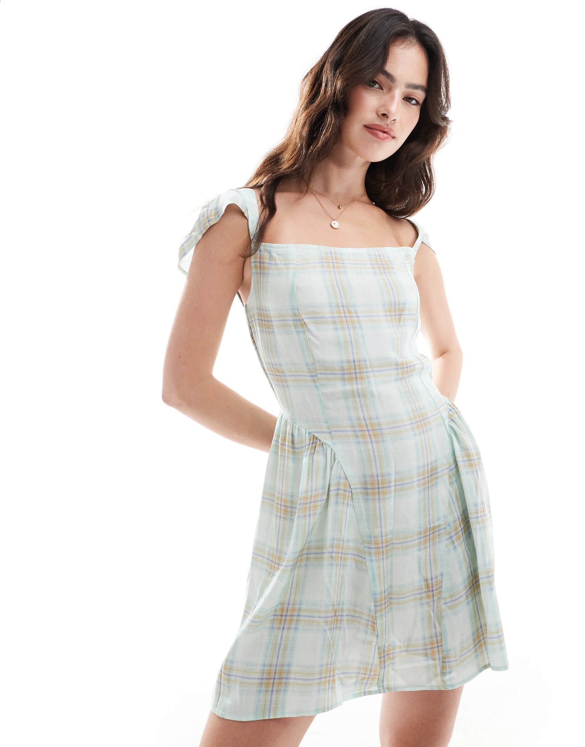 ASOS DESIGN cap sleeve fit and flare mini dress in green check
