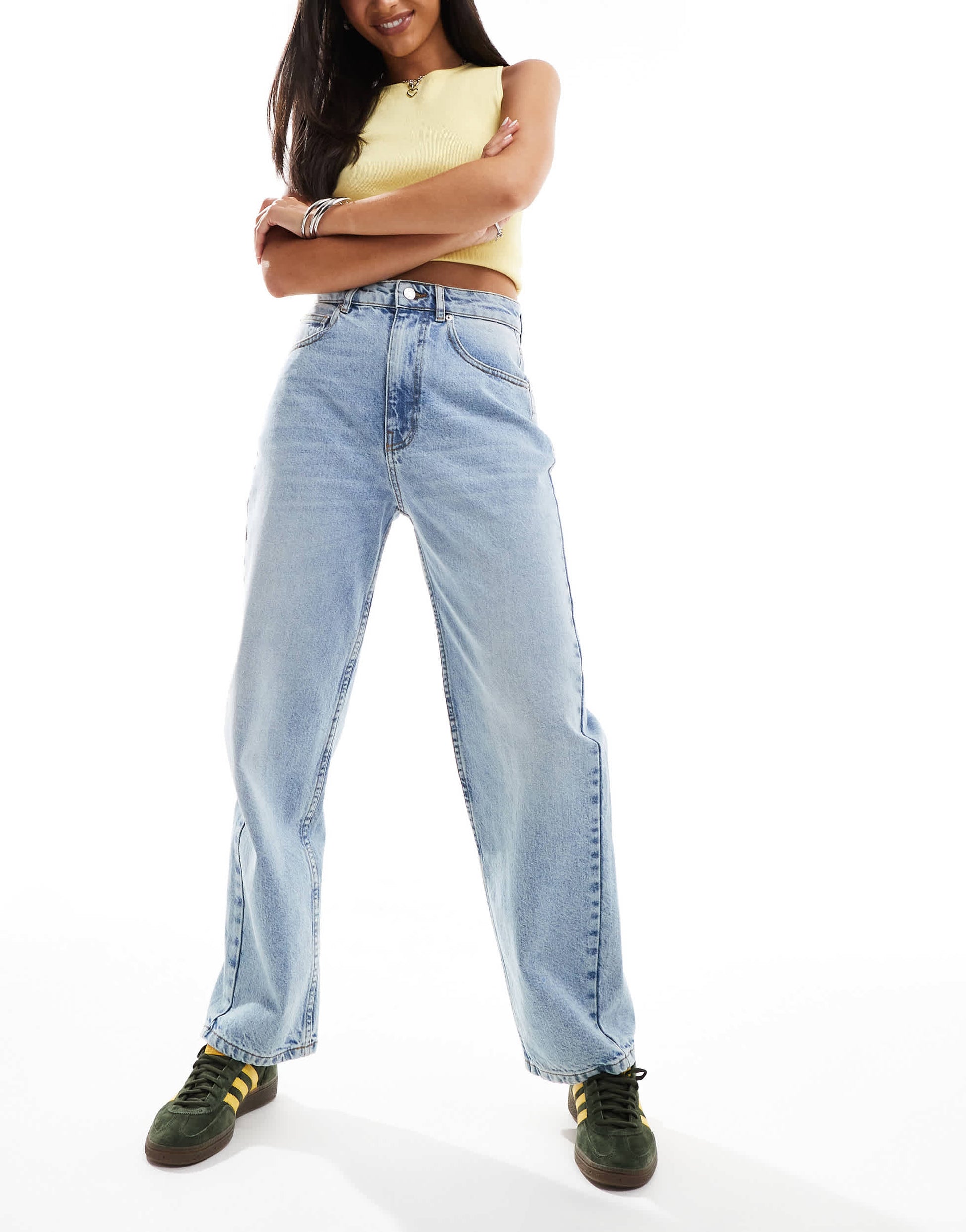 ASOS DESIGN cinched waist barrel leg jean in light mid blue