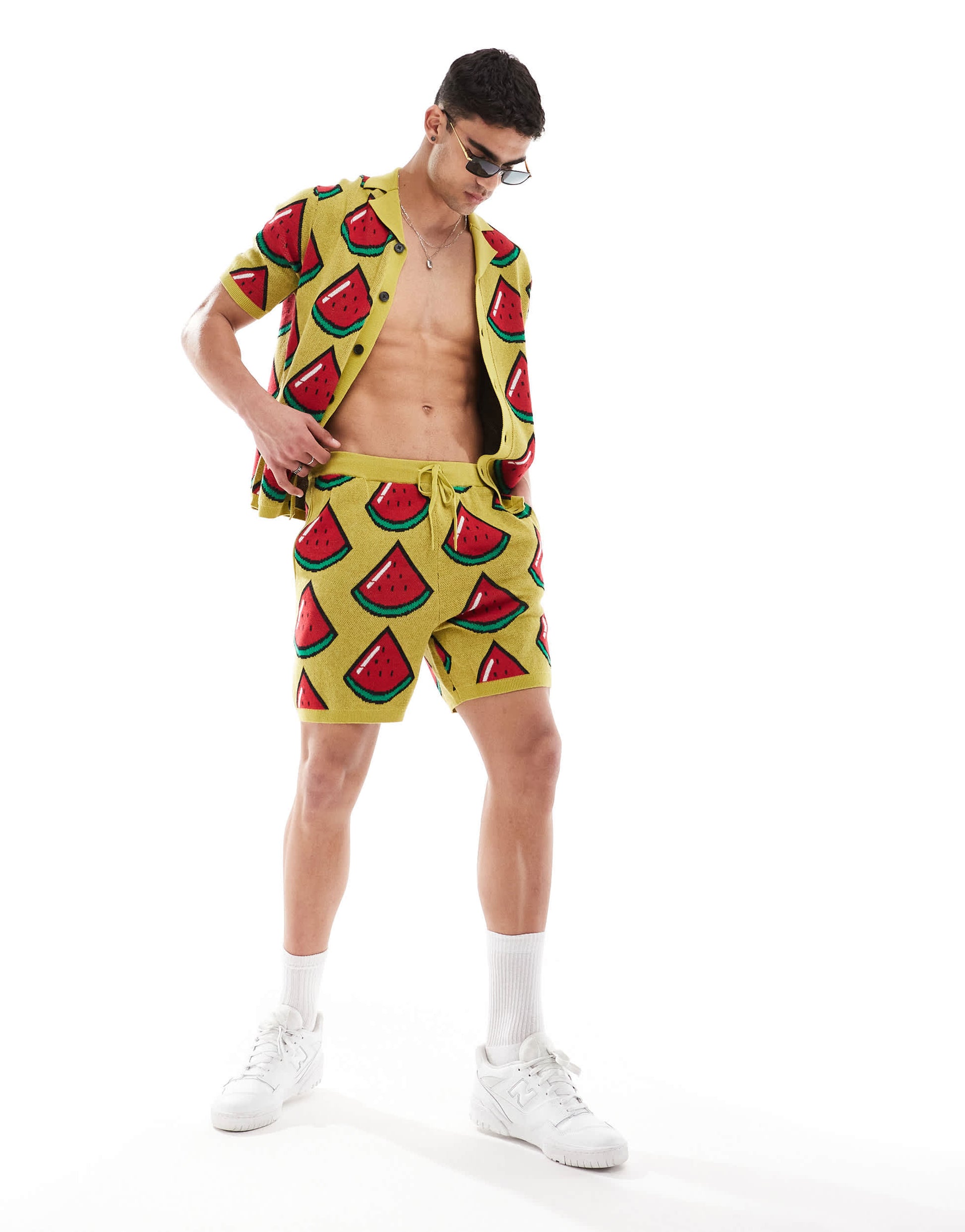 ASOS DESIGN co-ord knitted button through polo in green watermelon design
