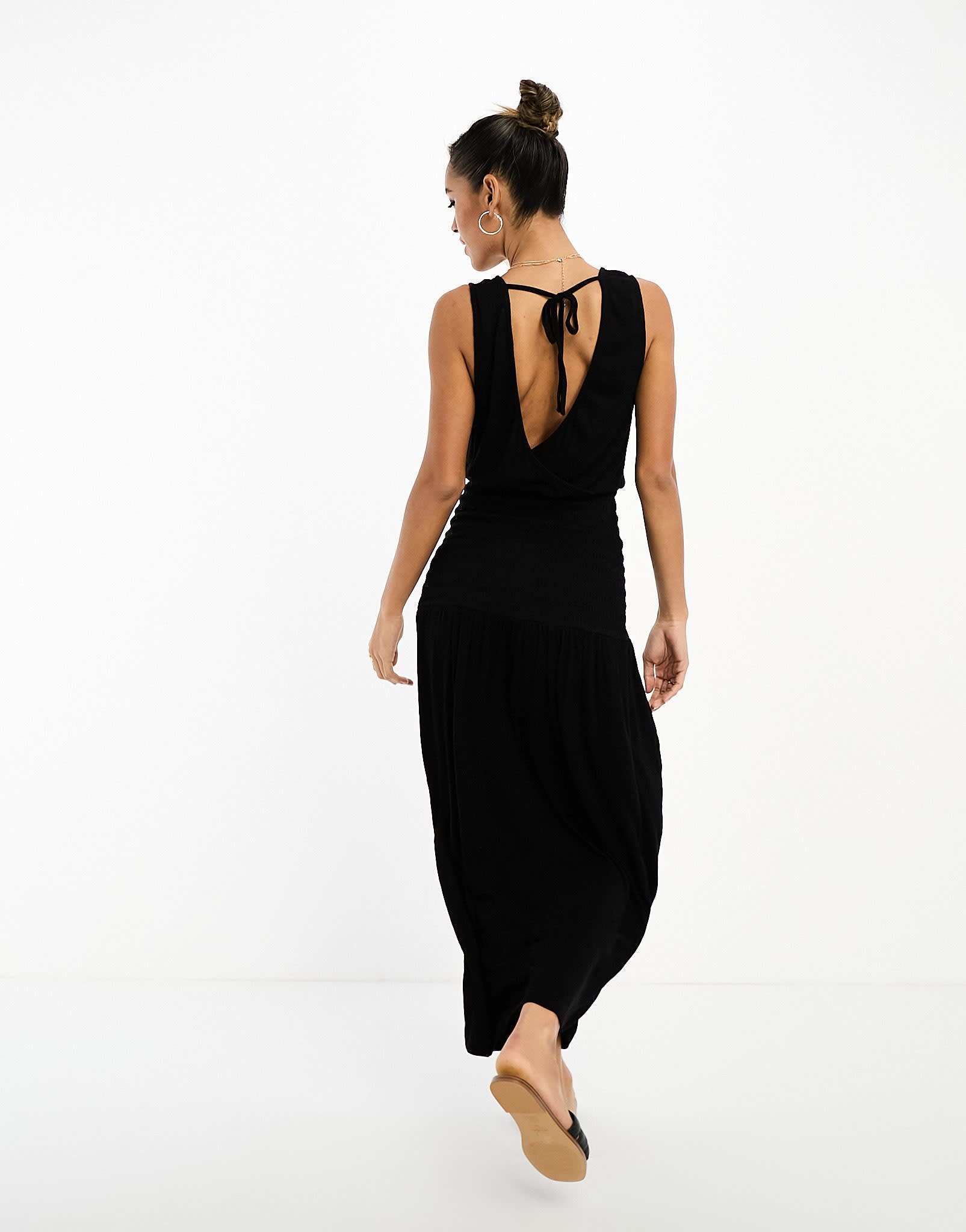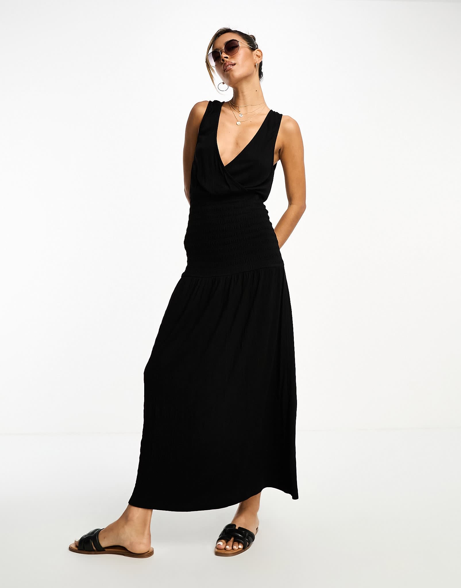 ASOS DESIGN crinkle v neck maxi smock dress with shirred waist in black