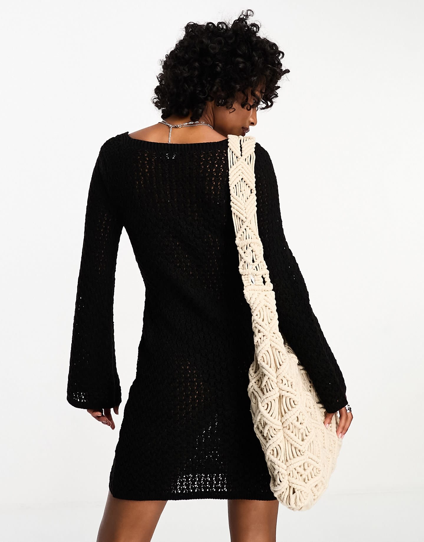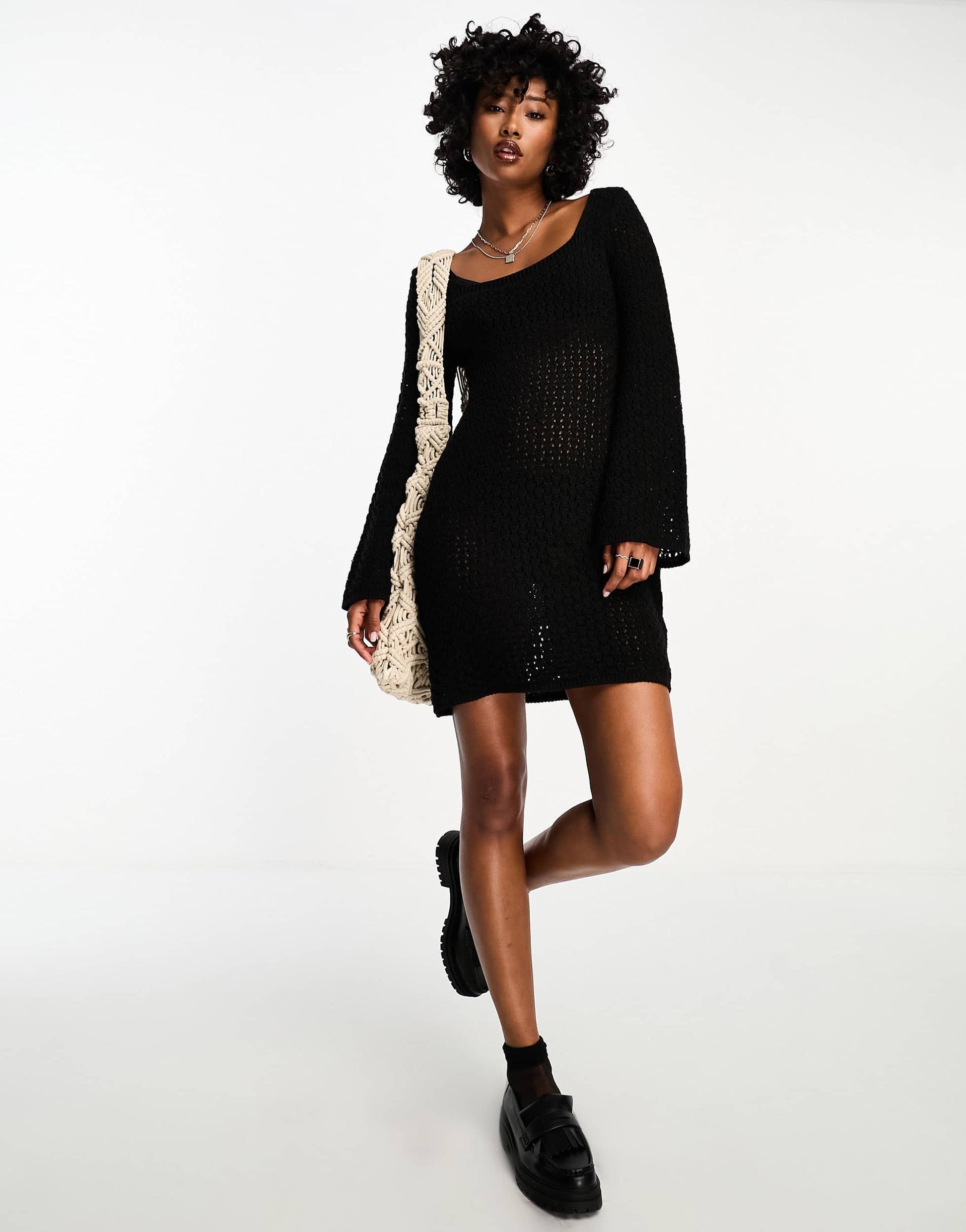 ASOS DESIGN crochet mini dress with flared long sleeves in black