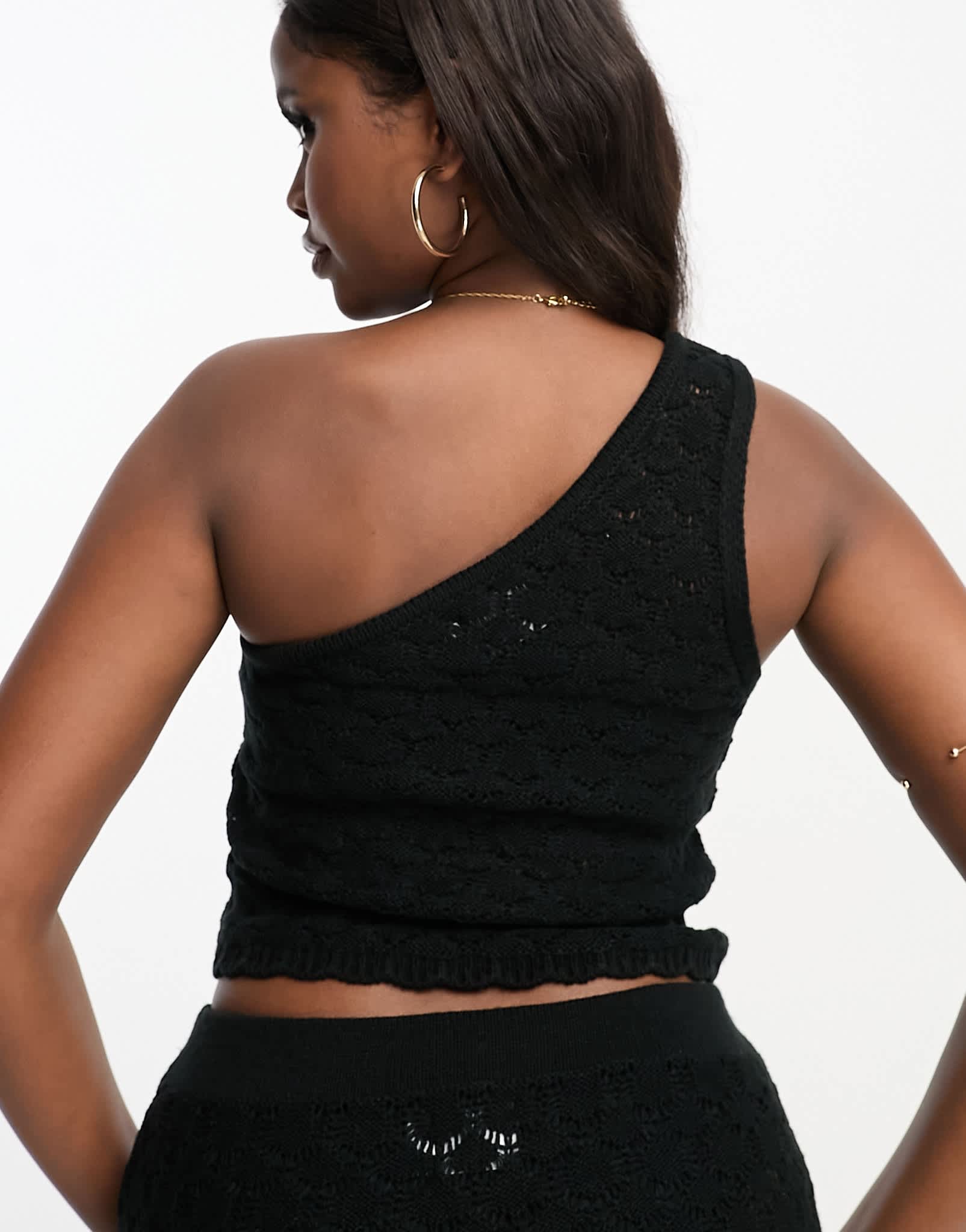 ASOS DESIGN crochet one shoulder top in wave stitch in black co-ord