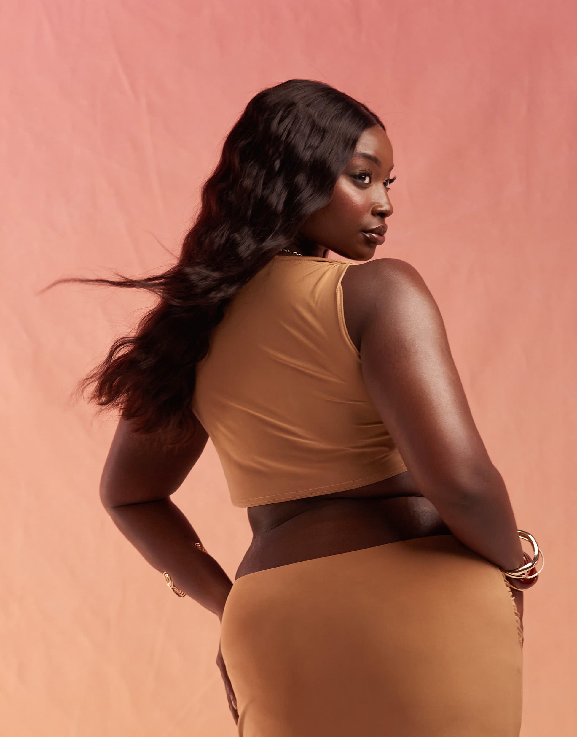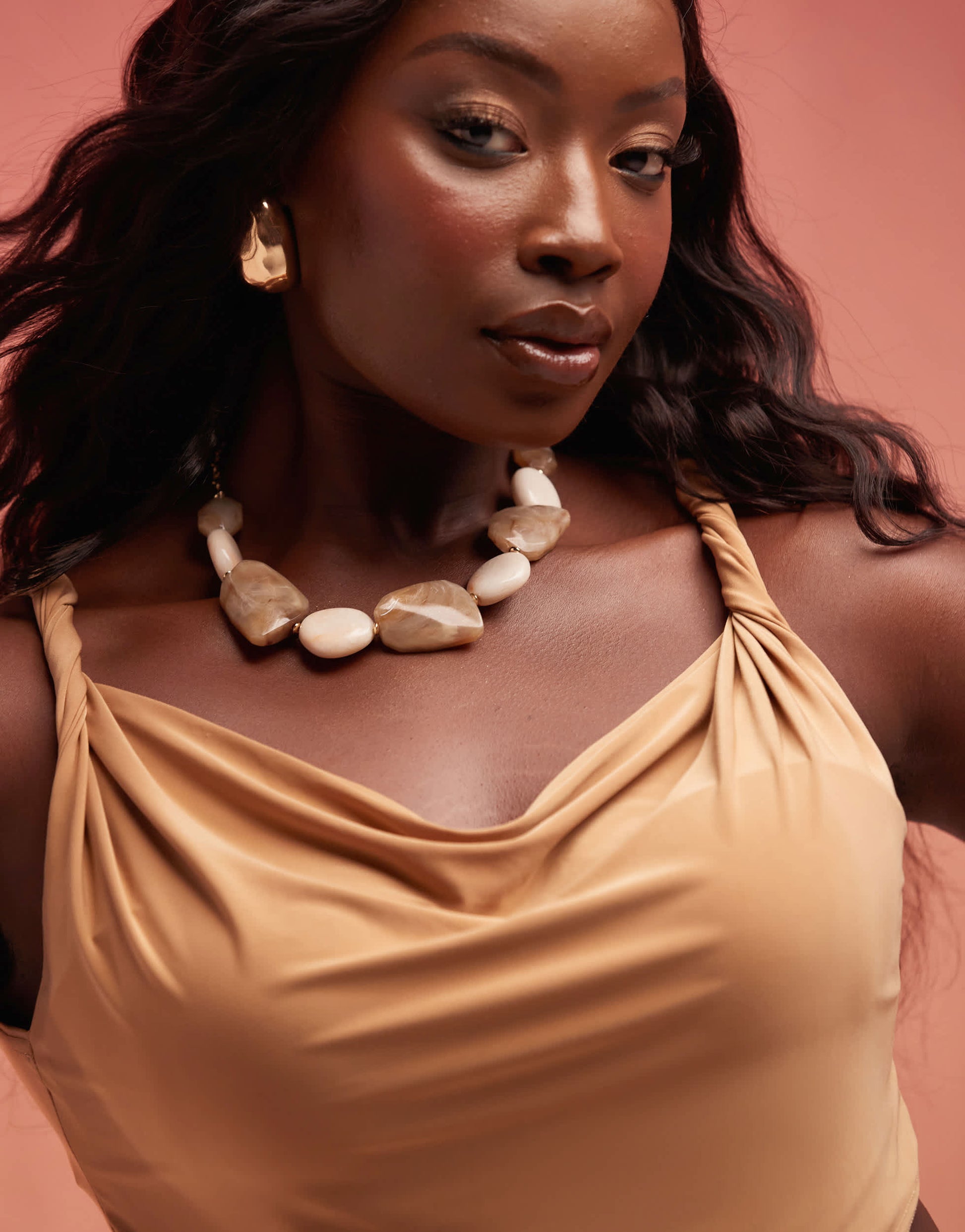 ASOS DESIGN Curve co-ord slinky twist shoulder top in sand