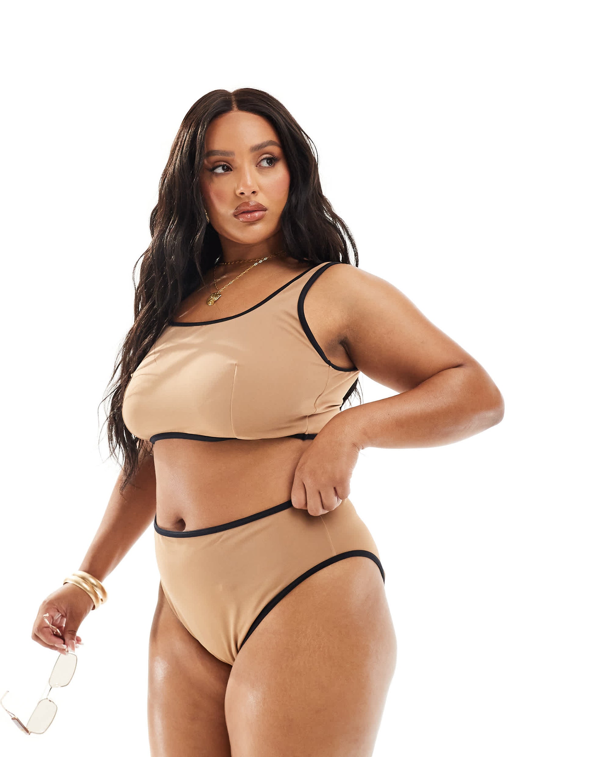 ASOS DESIGN Curve contrast binding high leg high waist bikini bottom in mochaccino