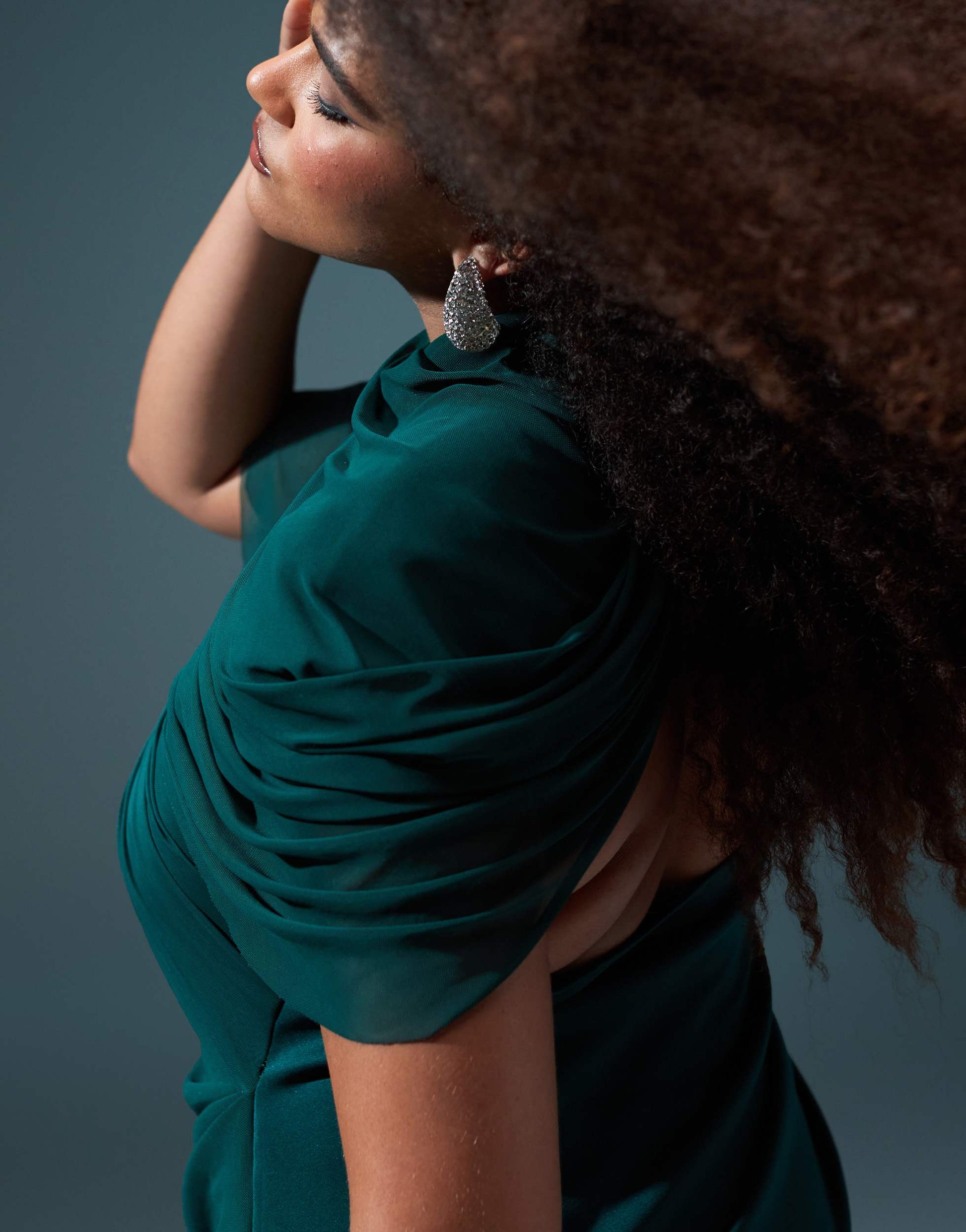 ASOS DESIGN Curve draped mesh shoulder pad premium maxi dress in forest green