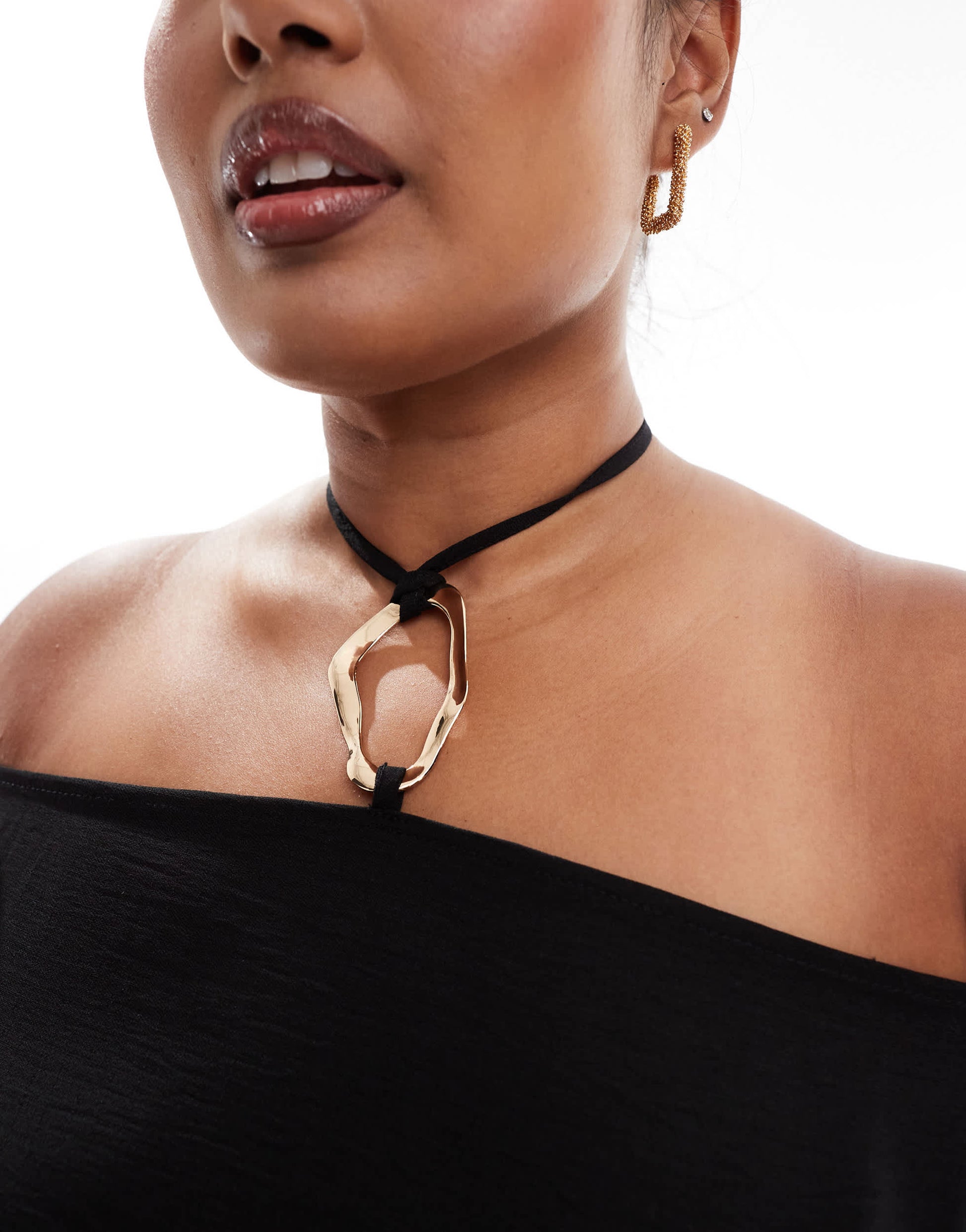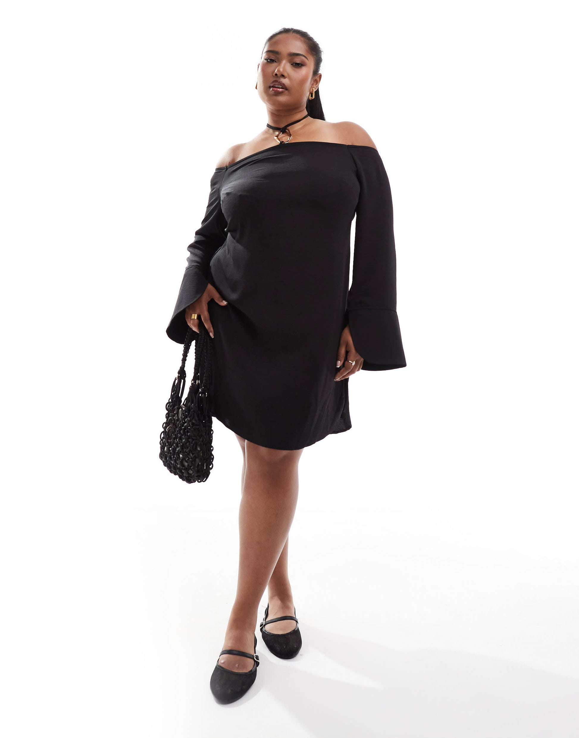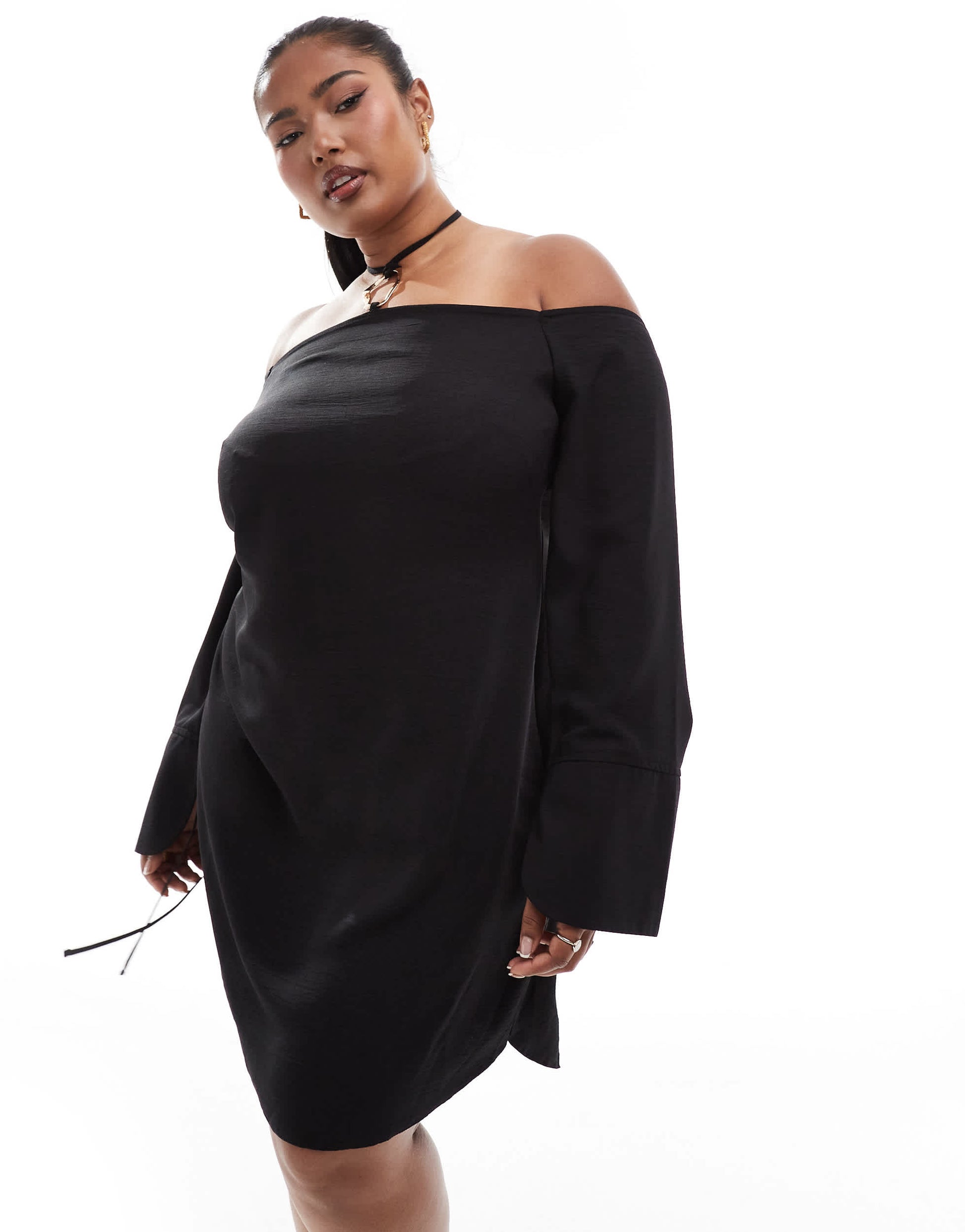 ASOS DESIGN Curve off the shoulder halter neck mini dress with curved hem and hardware detail in black