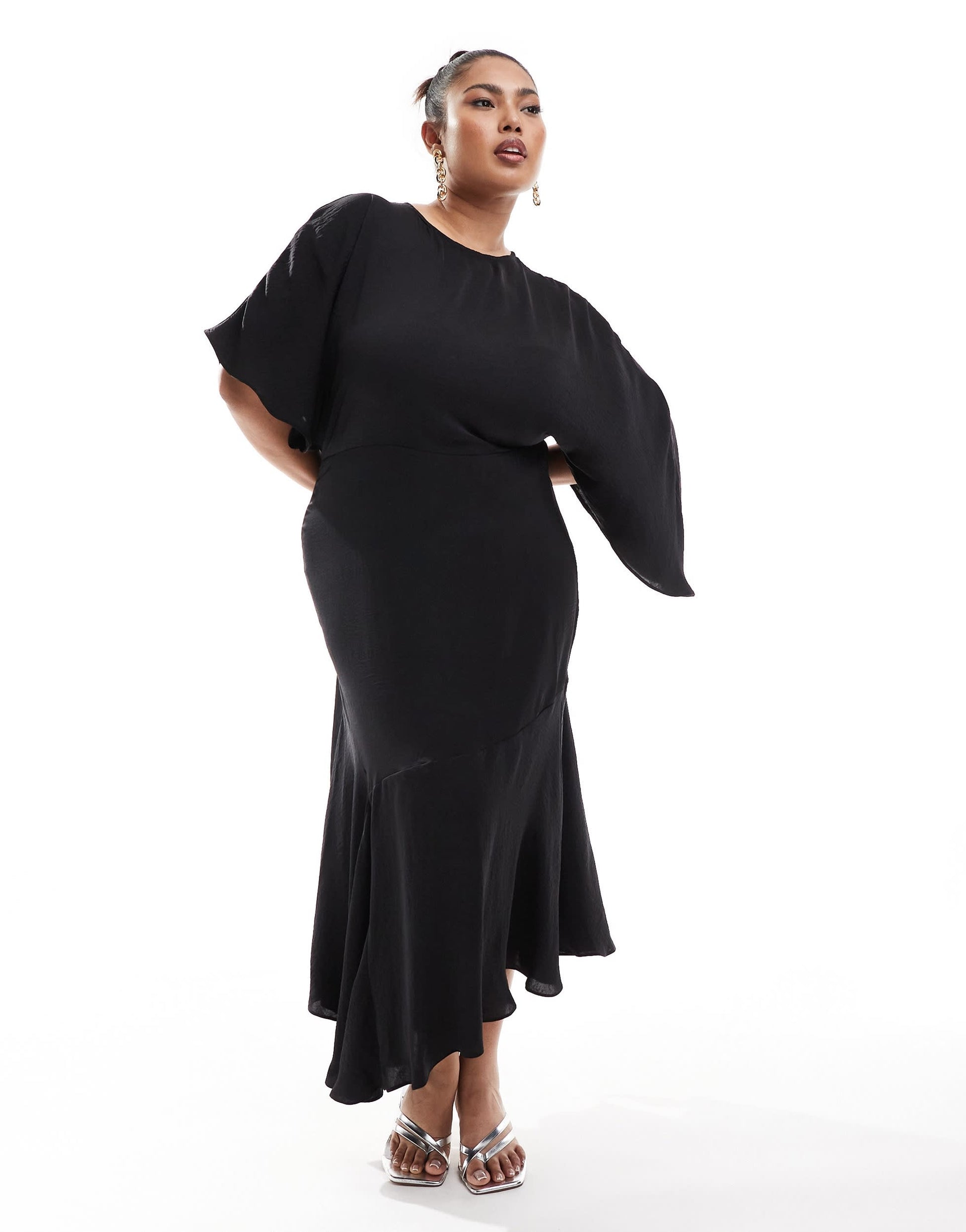 ASOS DESIGN Curve satin flutter sleeve asymmetric hem midi dress in black