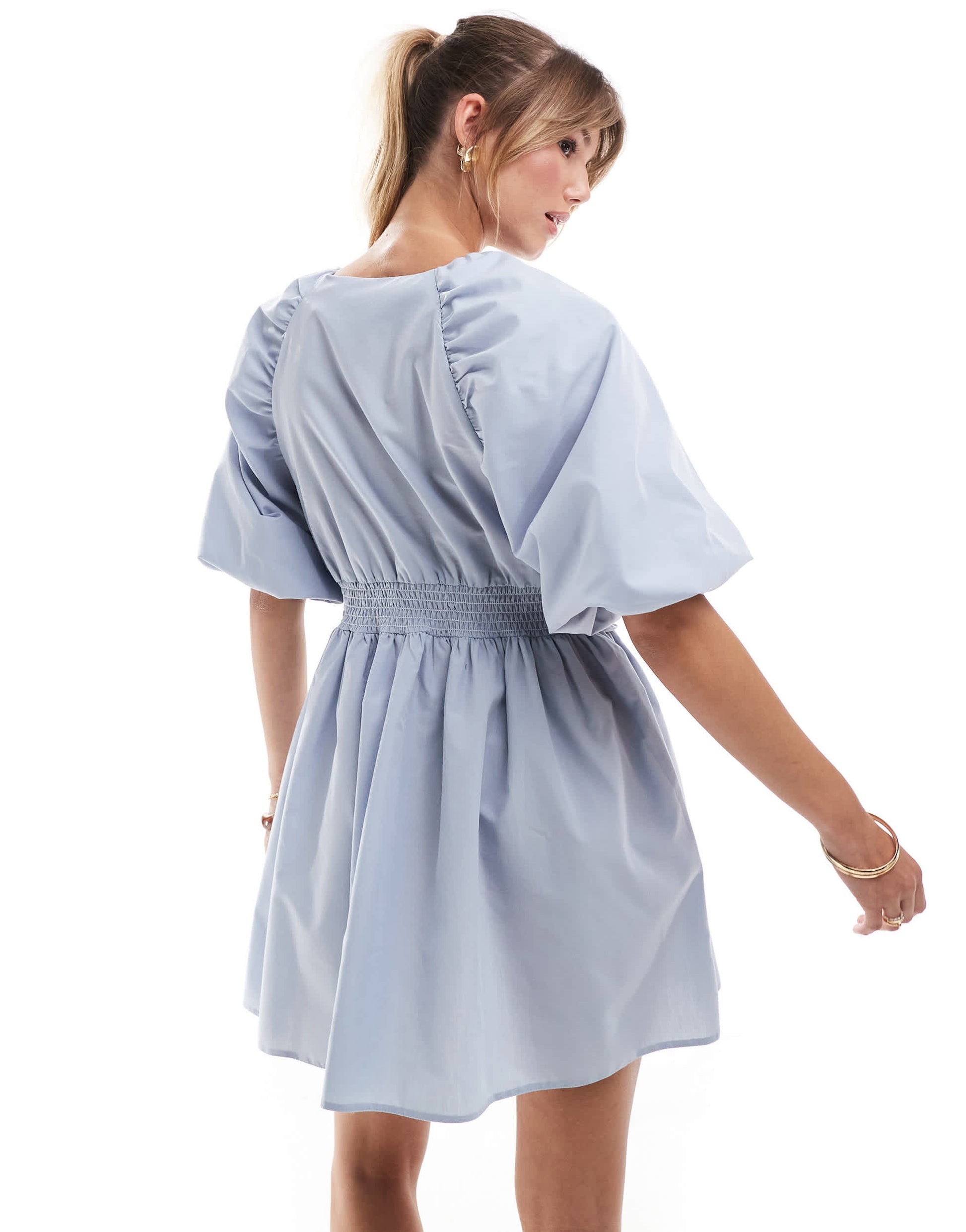 ASOS DESIGN double bow front mini dress with puff sleeves in light blue