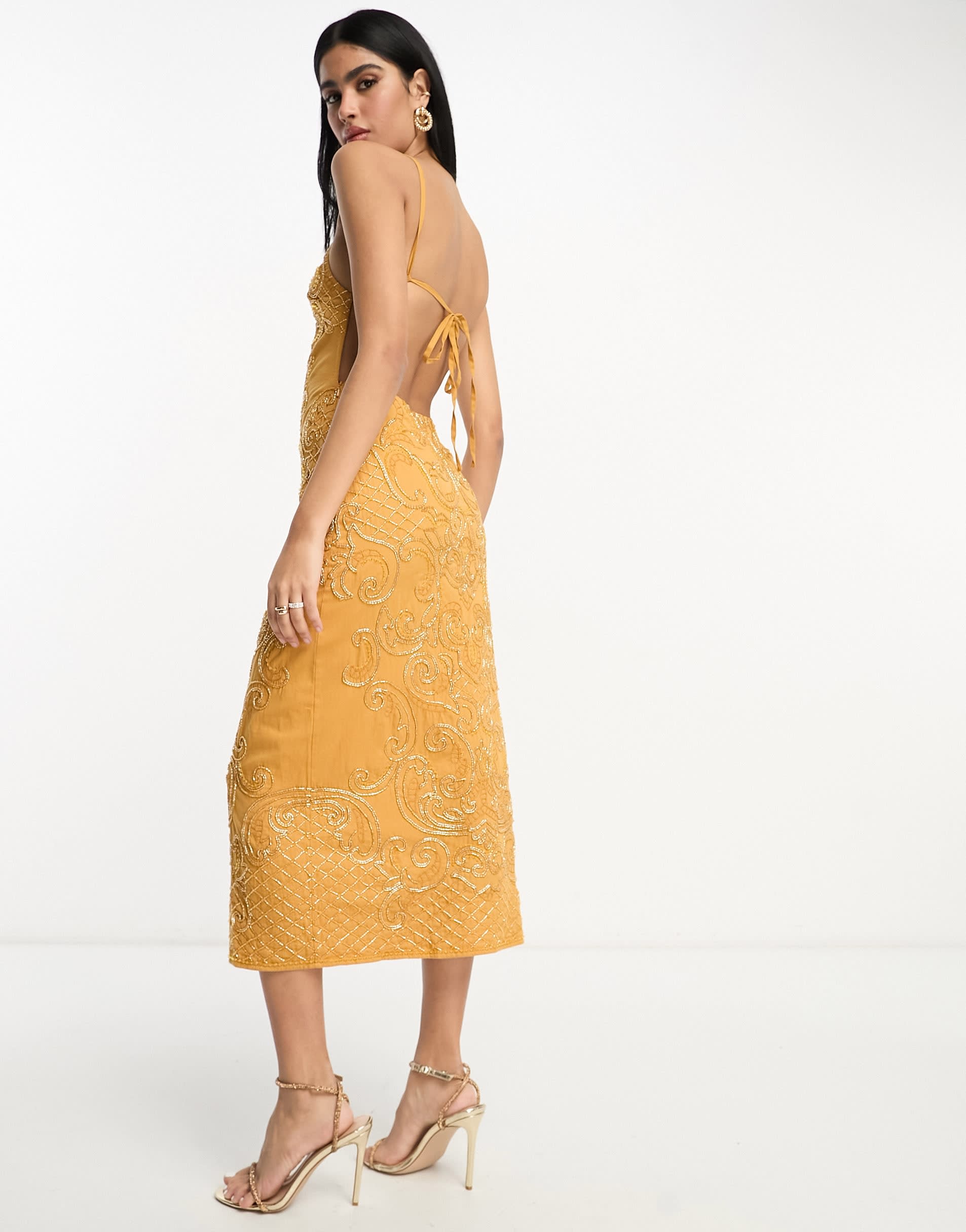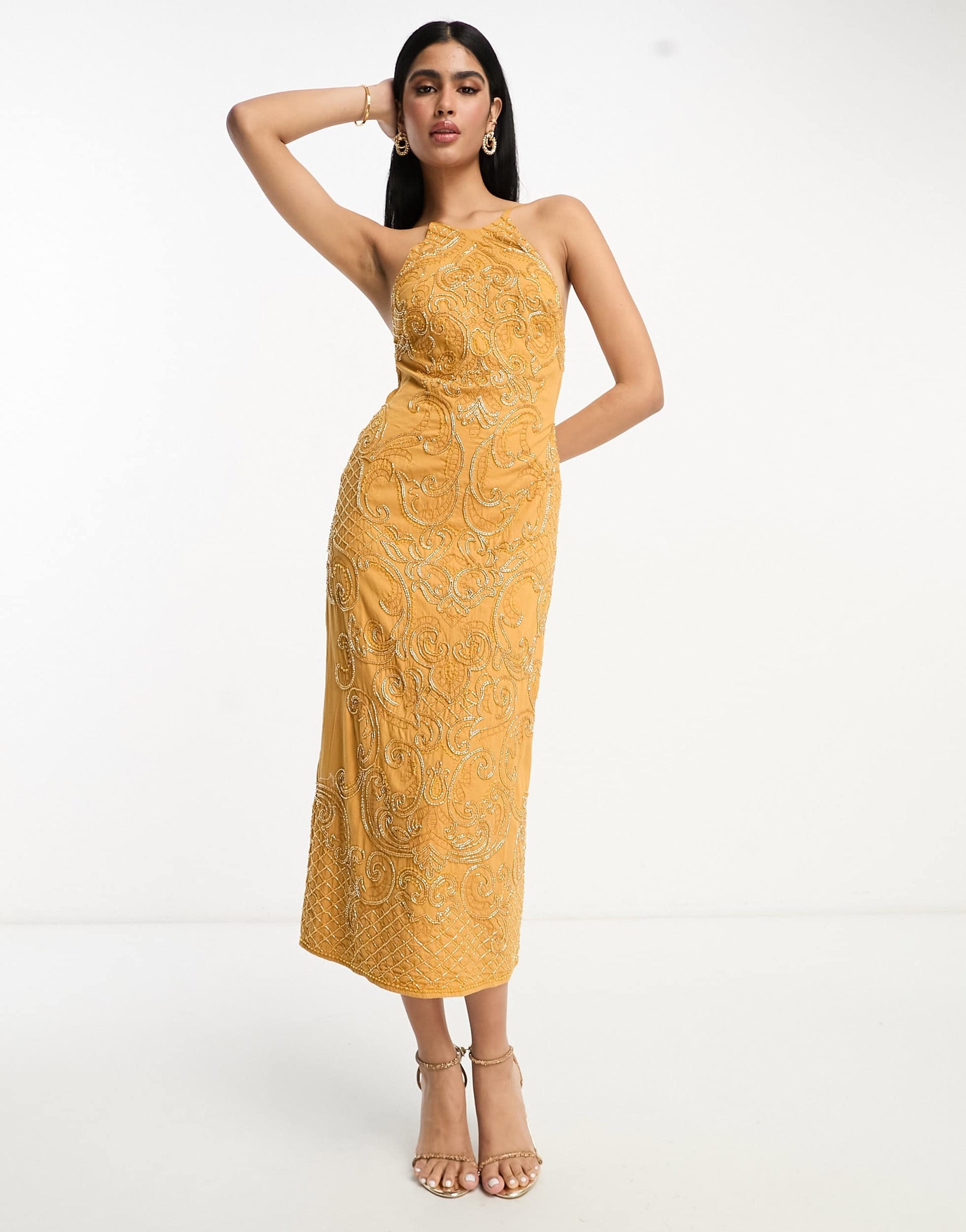 ASOS DESIGN embellished high neck midi dress with mirror beading detail in mustard