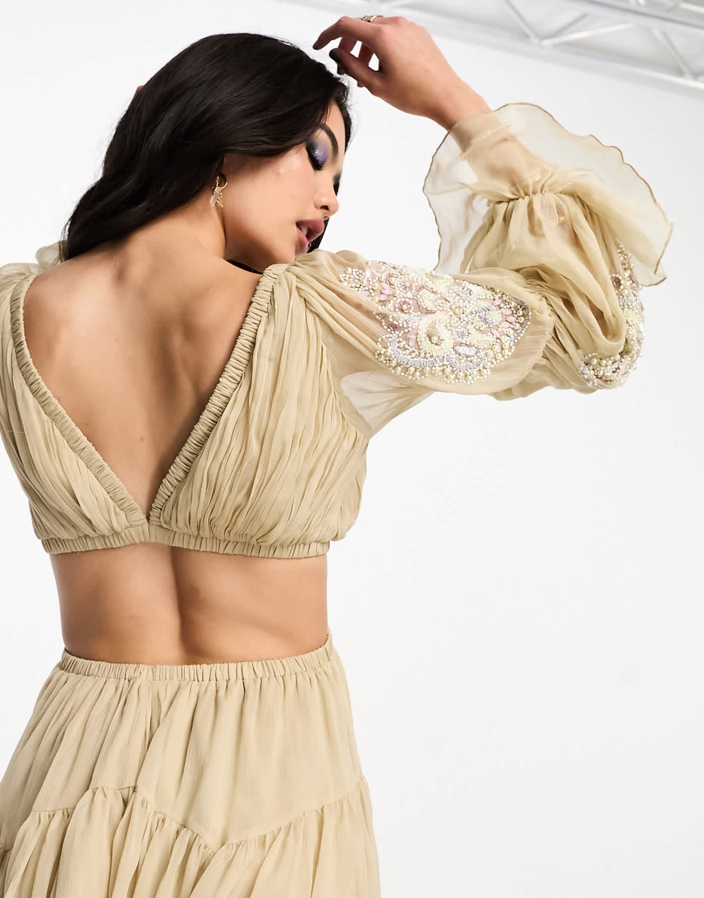 ASOS DESIGN embellished square neck elasticated mini dress with contrast embroidery in stone