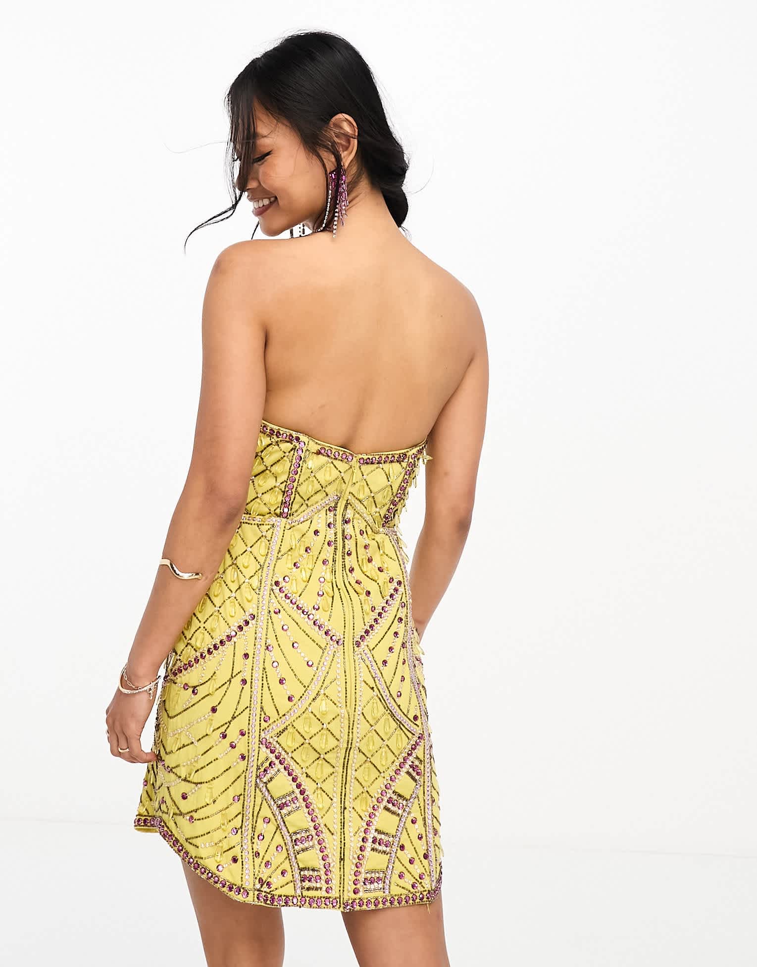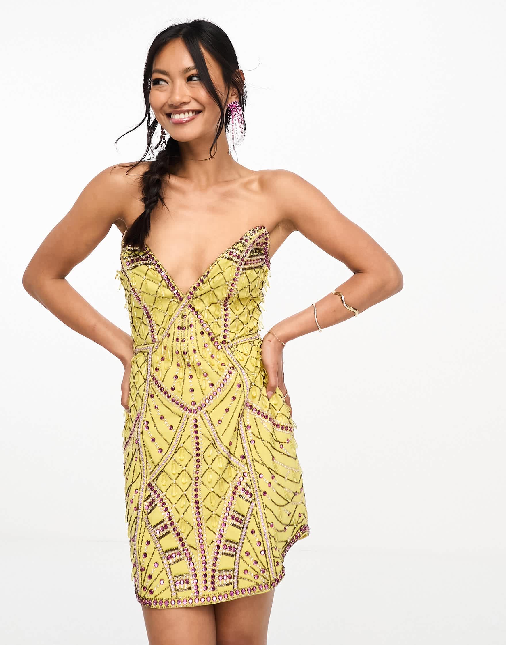 ASOS DESIGN embellished structured plunge mini dress with curve hem in yellow