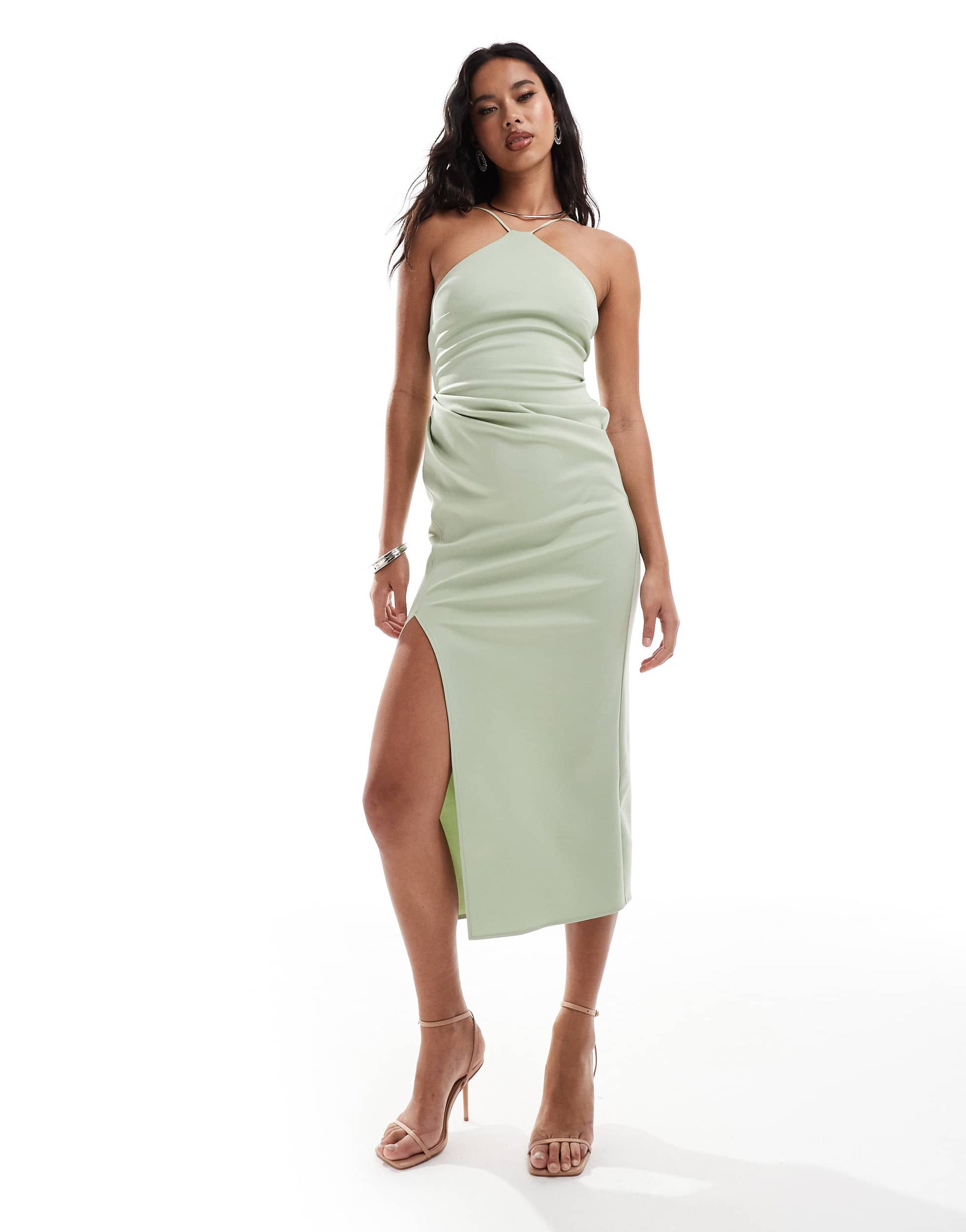ASOS DESIGN halterneck midi dress with wrap skirt in sage green