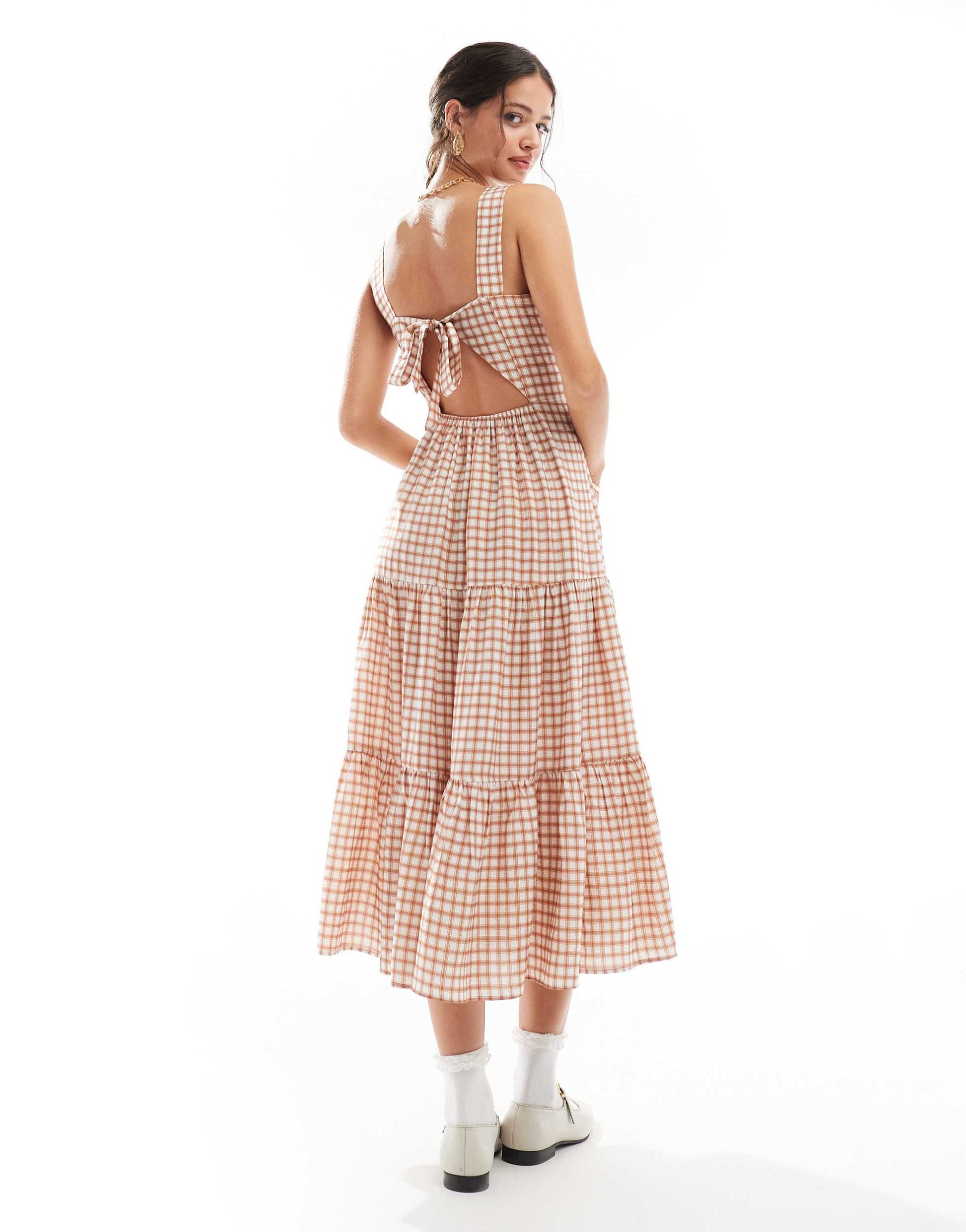 ASOS DESIGN knot detail tiered midi dress in brown gingham