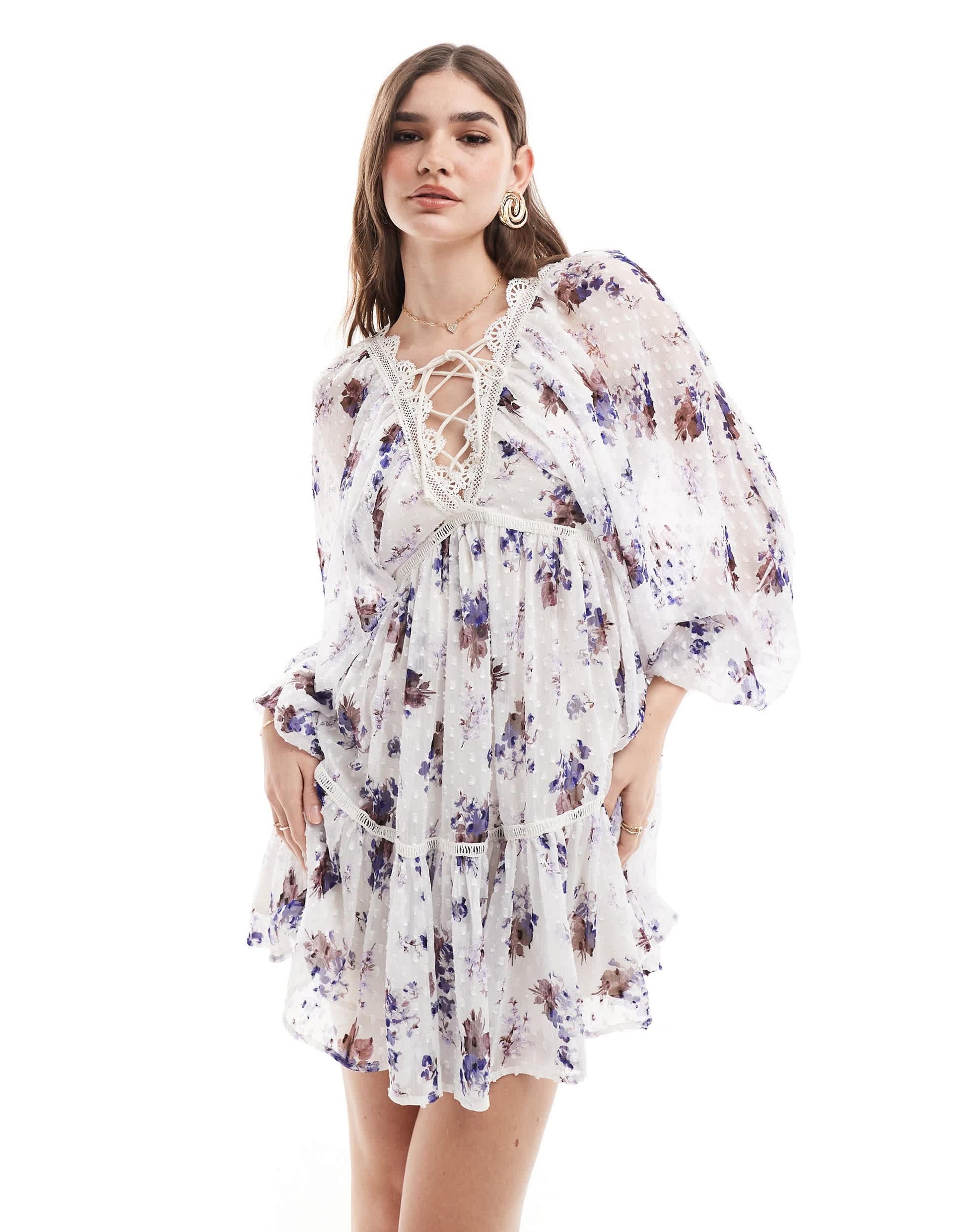 ASOS DESIGN lace trim plunge batwing mini dress with pep hem in white floral dobby