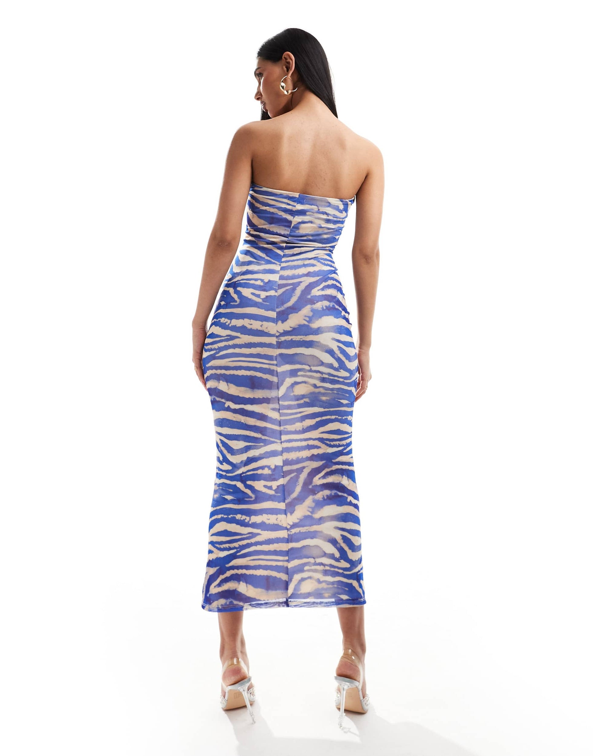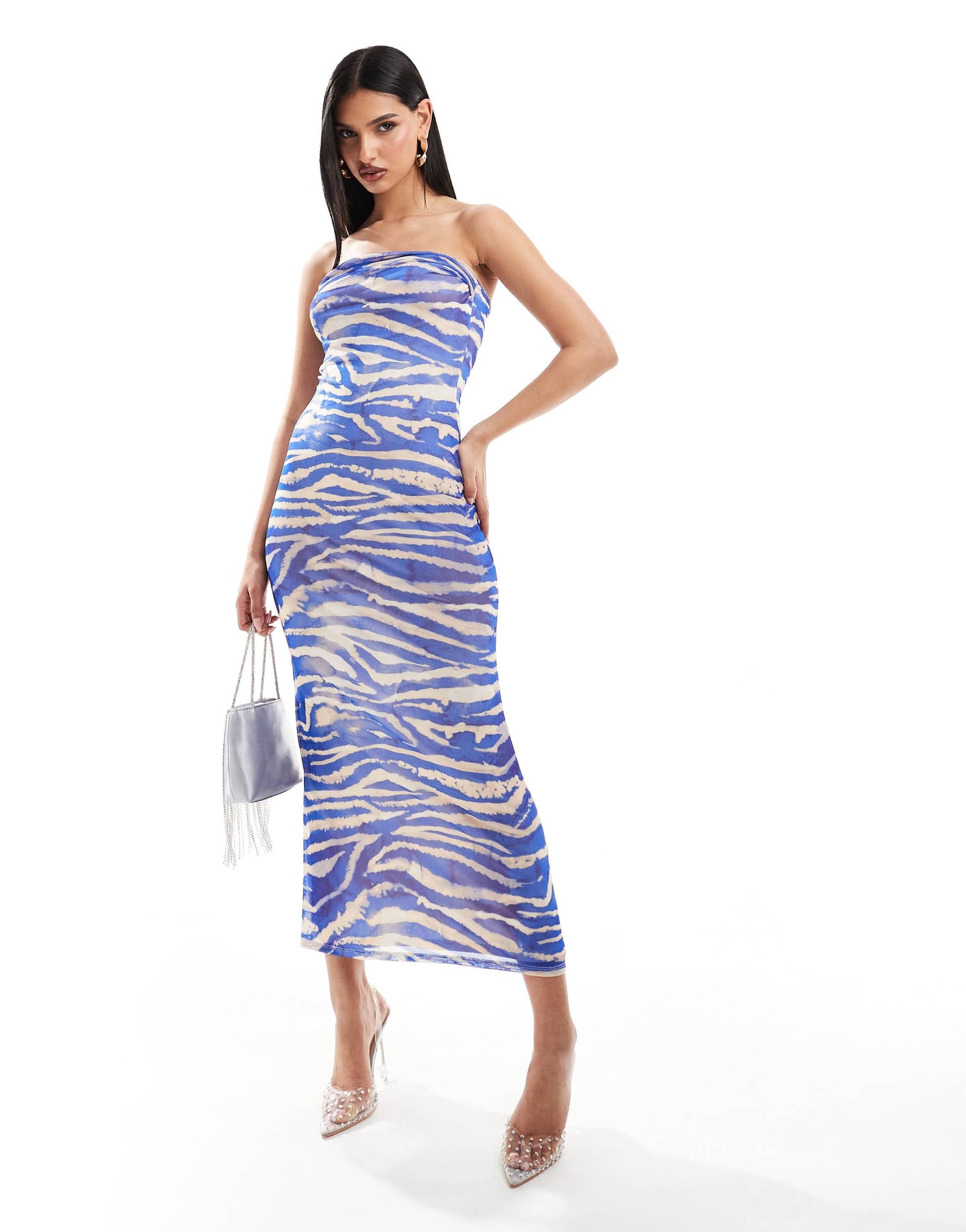 ASOS DESIGN mesh bandeau cowl neck midi dress in blue zebra print