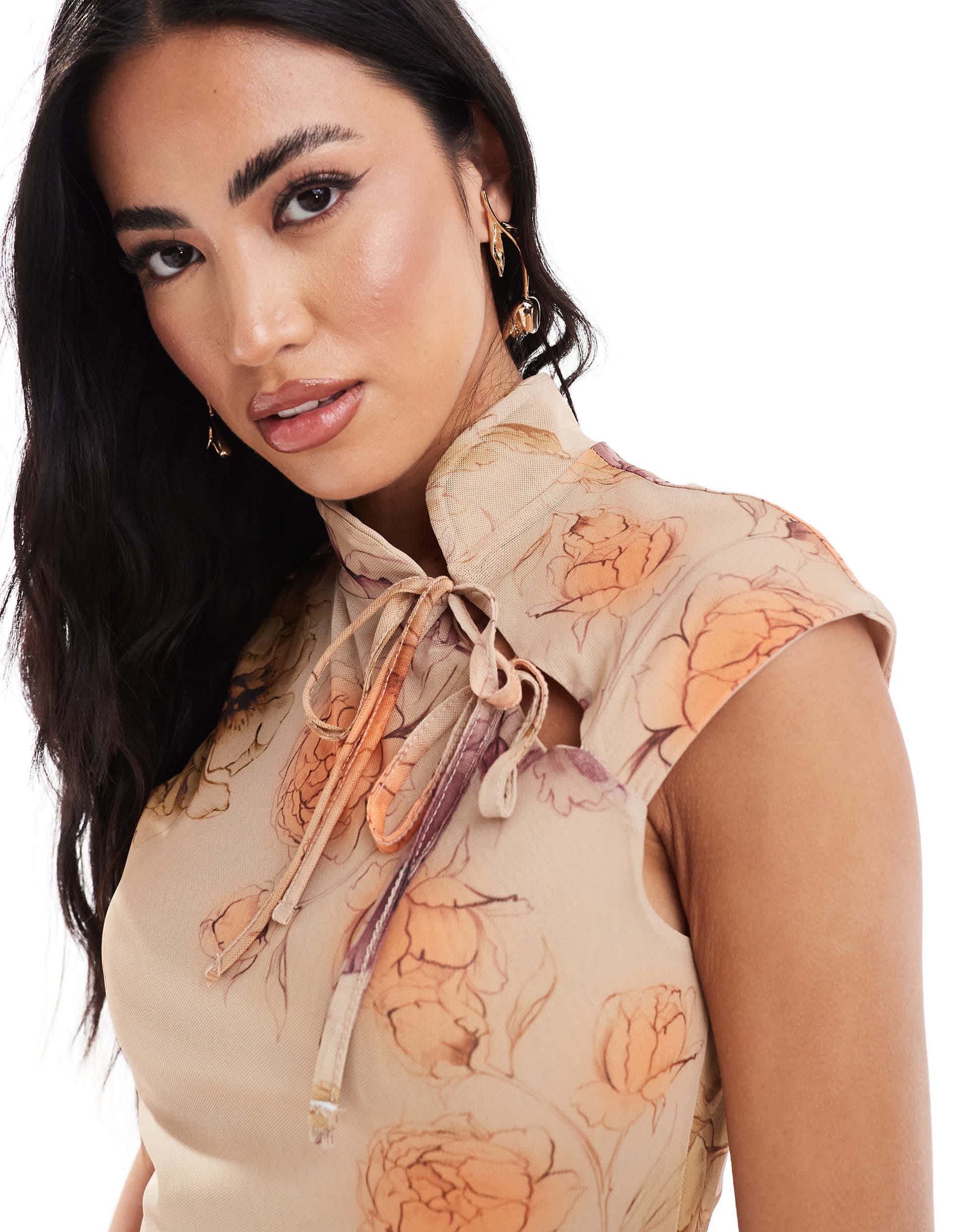 ASOS DESIGN mesh cap sleeve tie neck detail maxi dress in vintage floral print