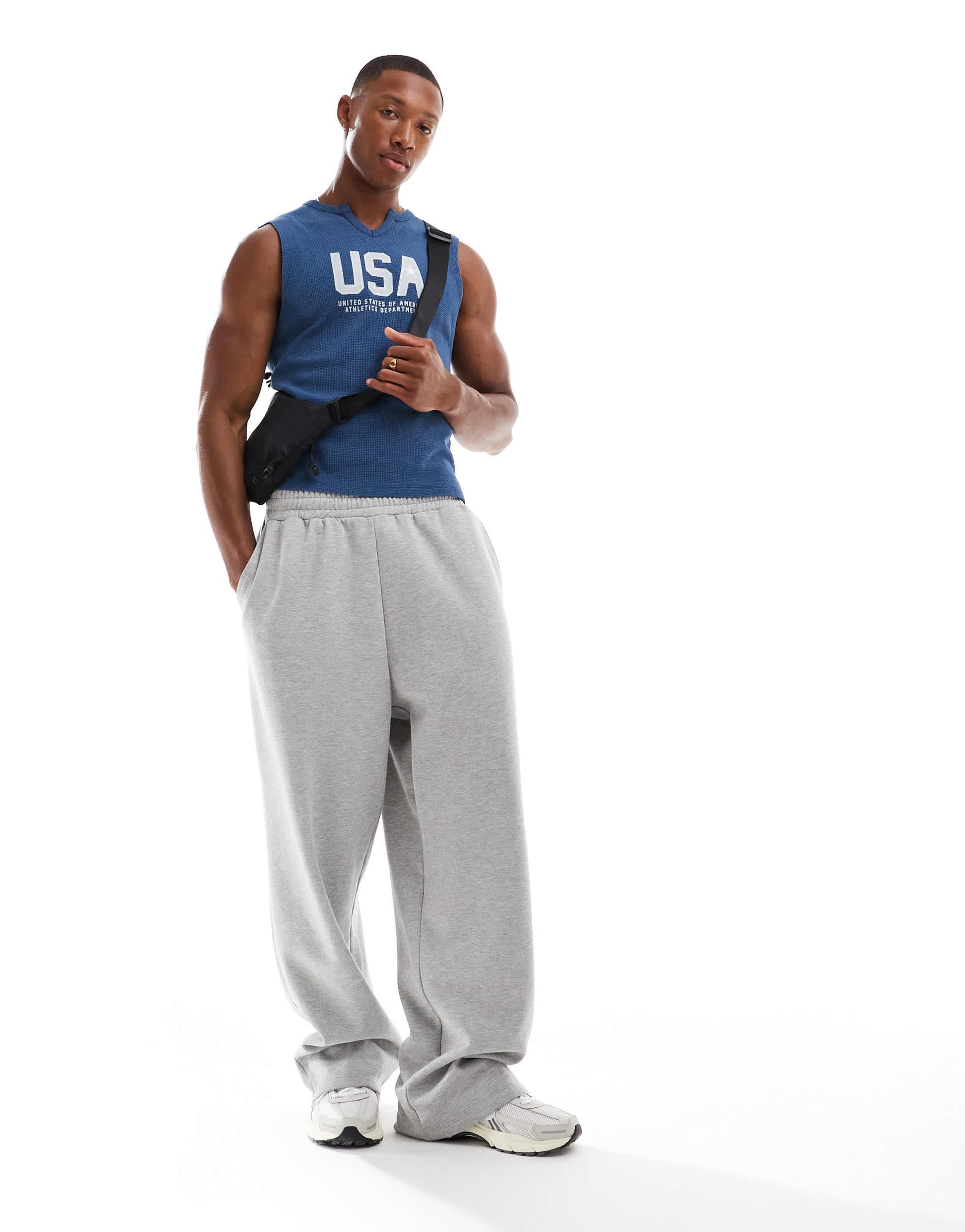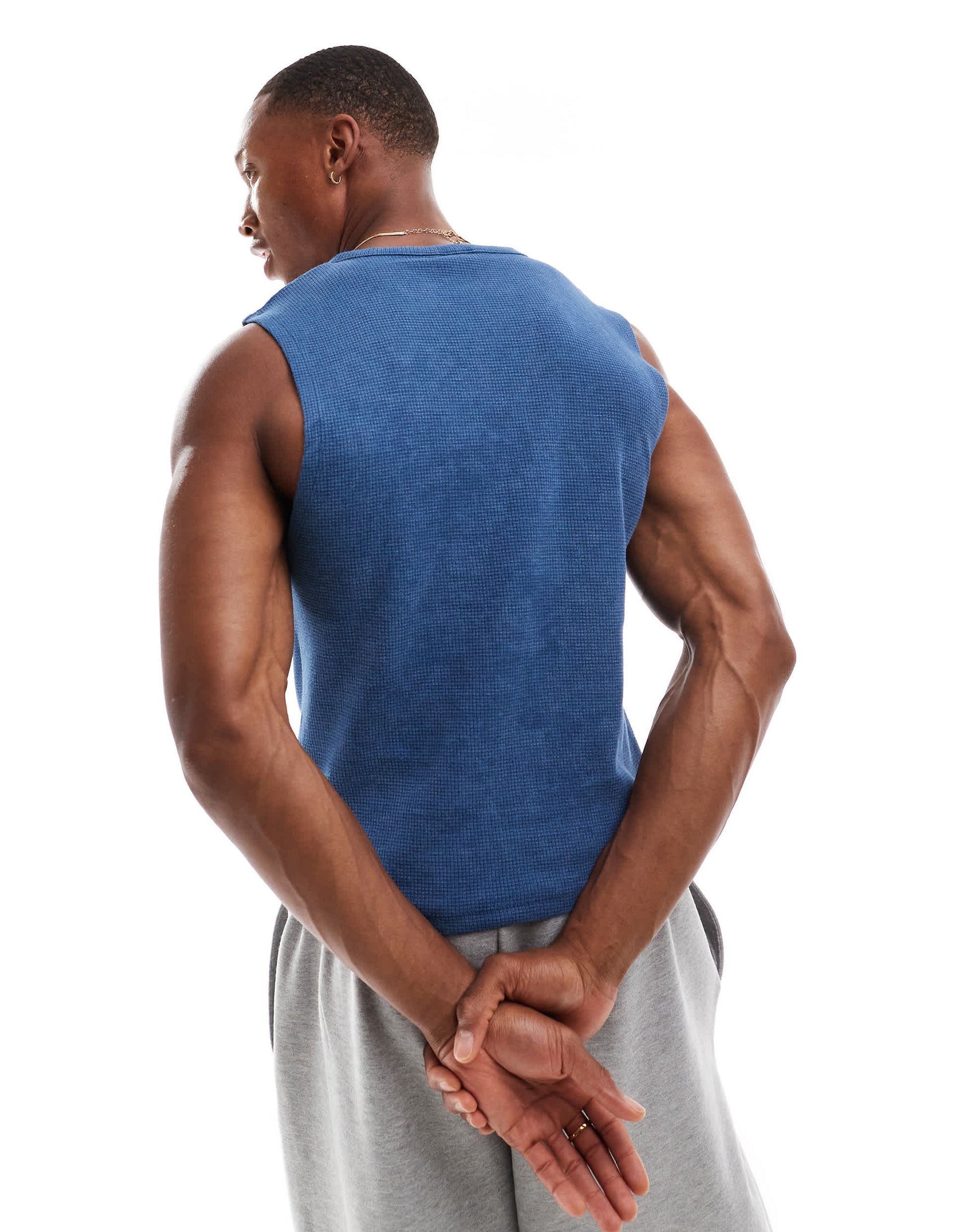 ASOS DESIGN muscle fit tank vest in blue with cut neck and USA chest print