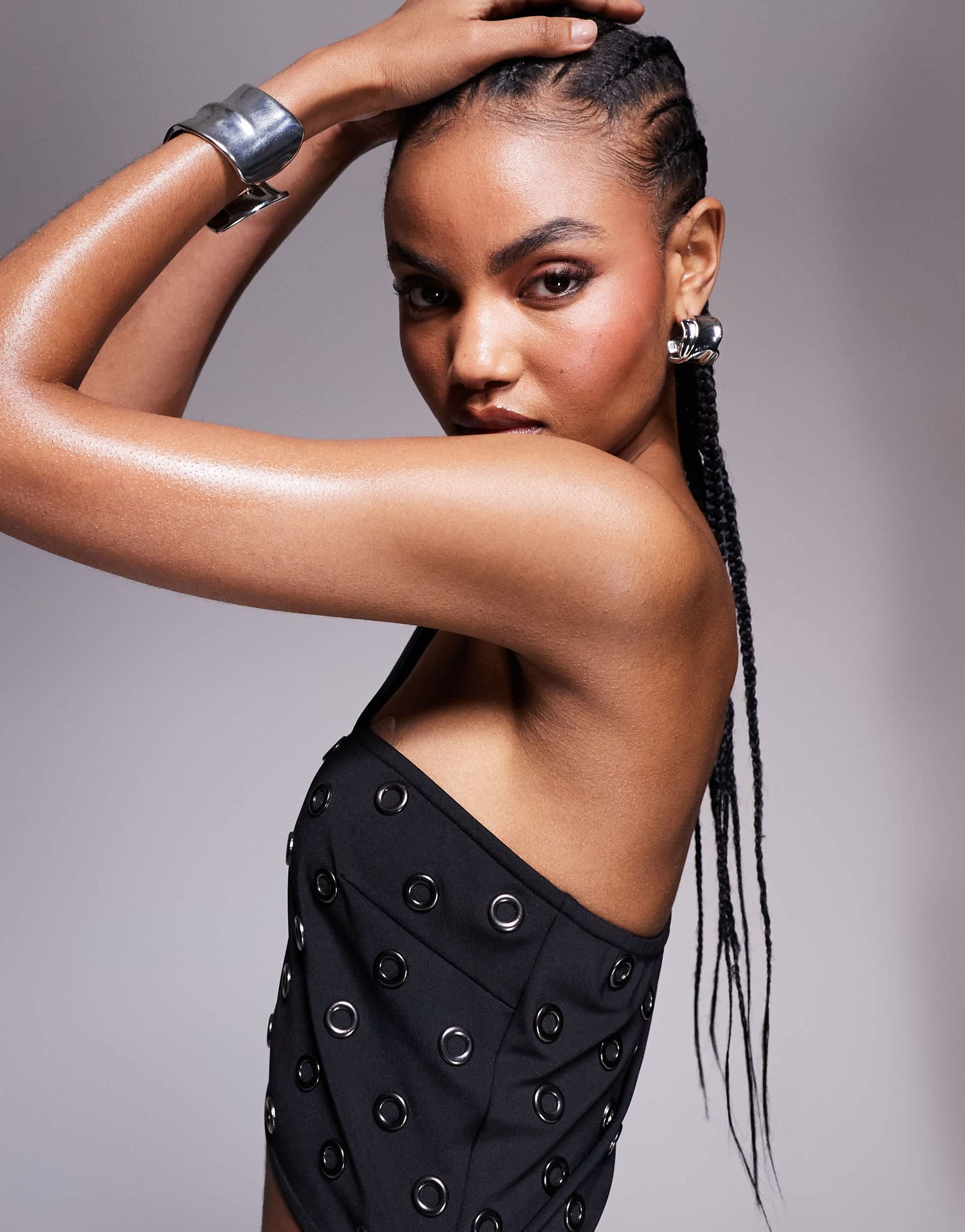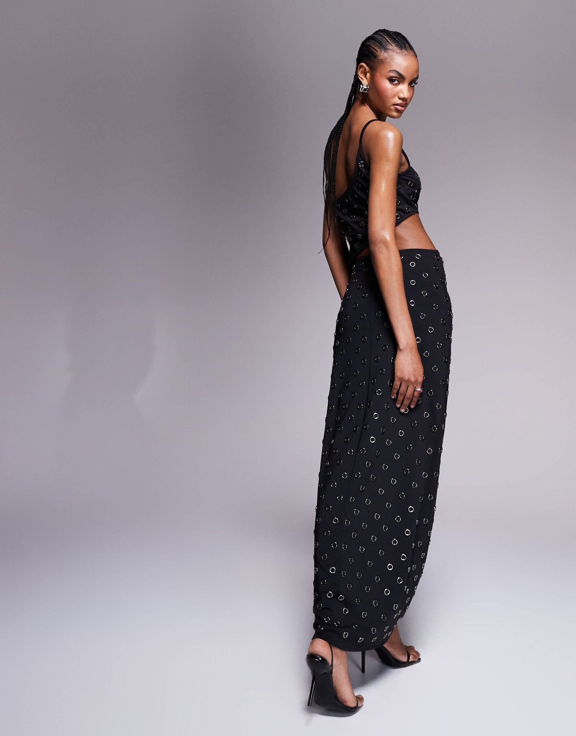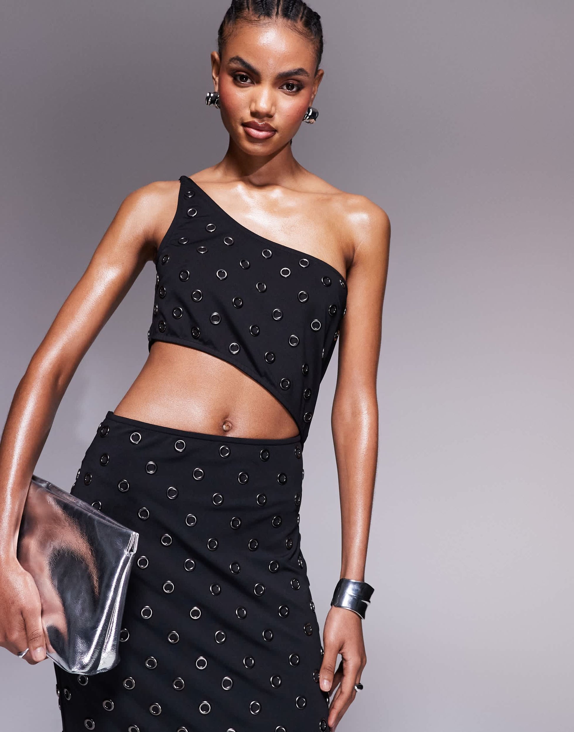 ASOS DESIGN one shoulder studded embellished column maxi dress in black