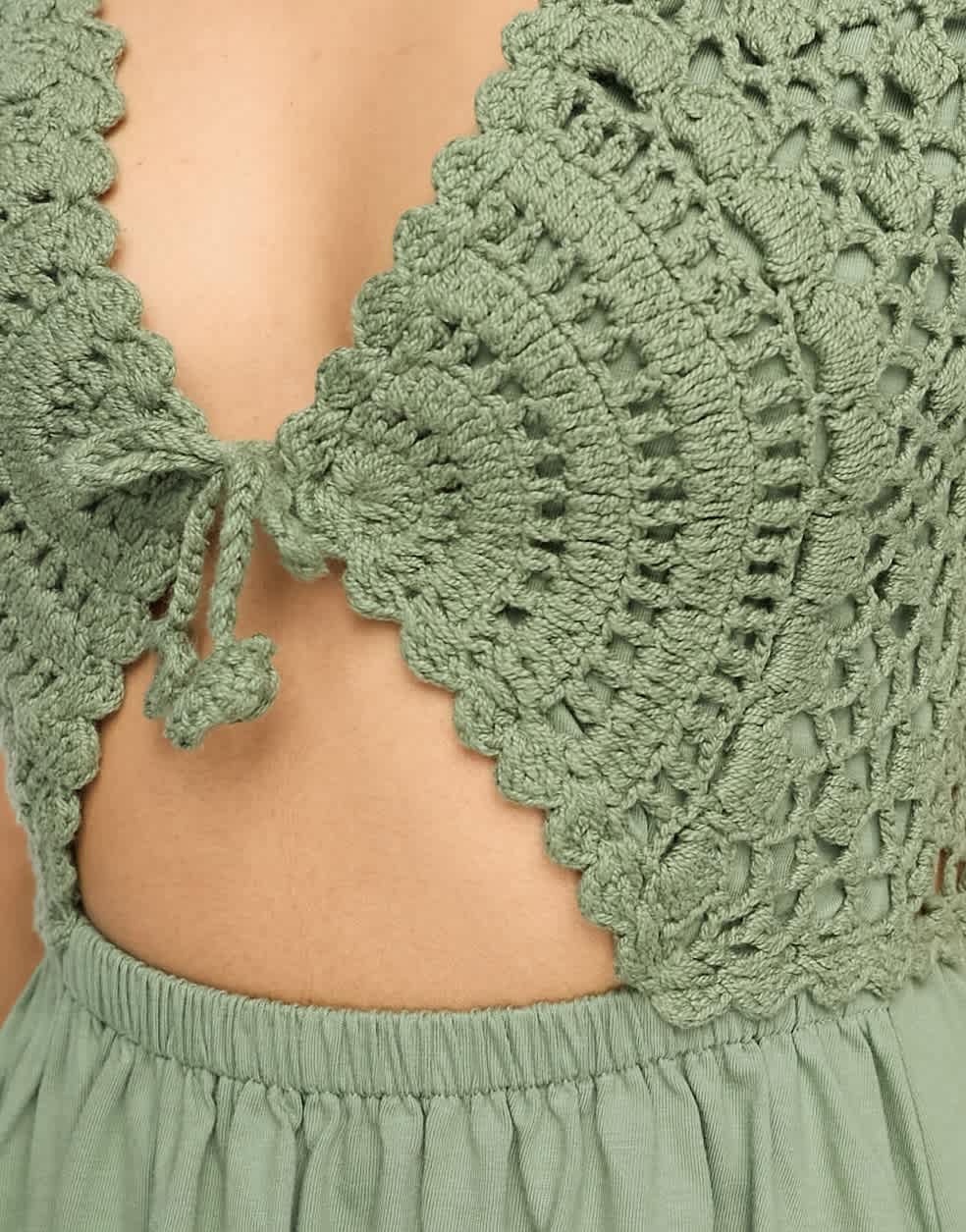 ASOS DESIGN Petite crochet mix mini dress with tie detail in khaki