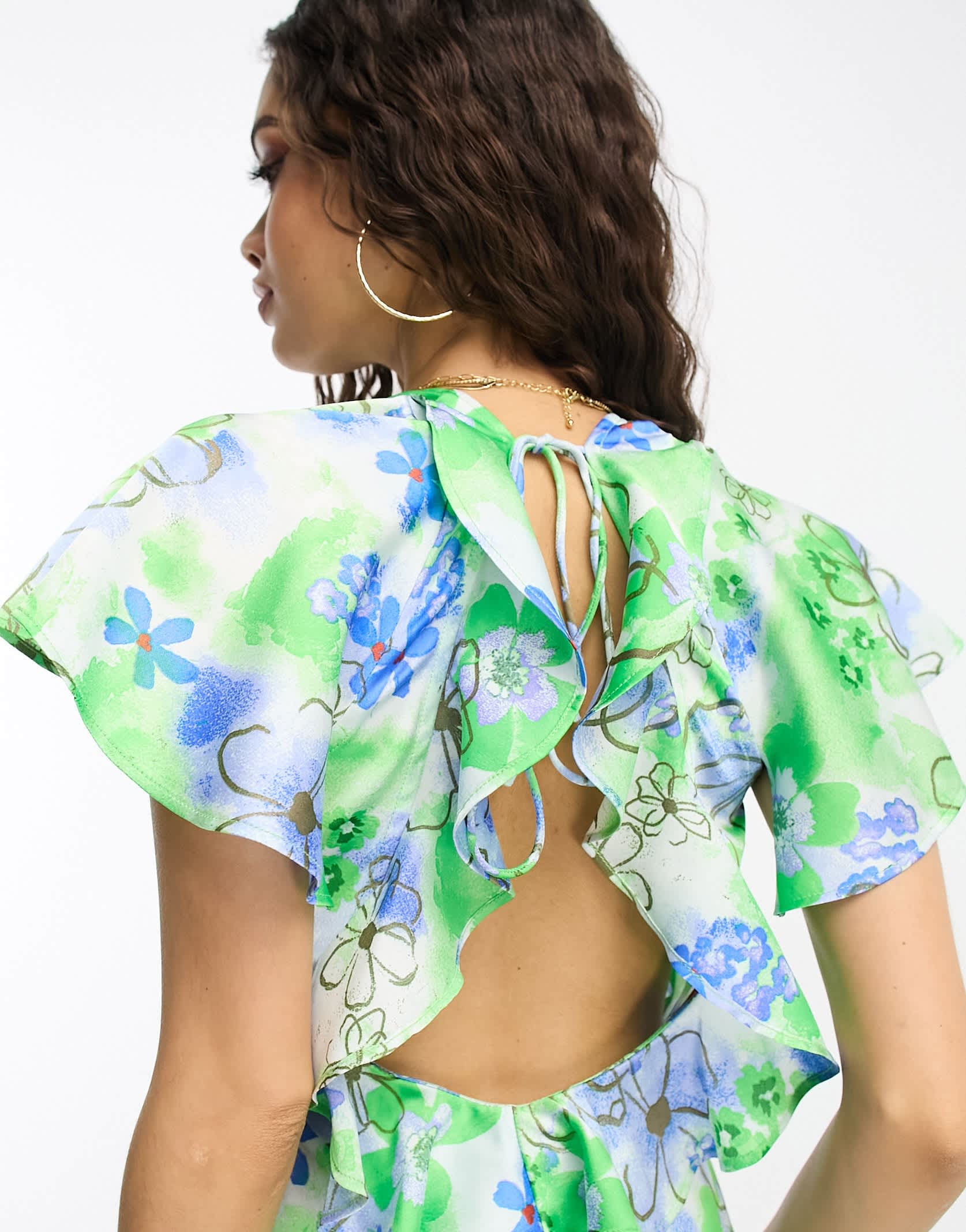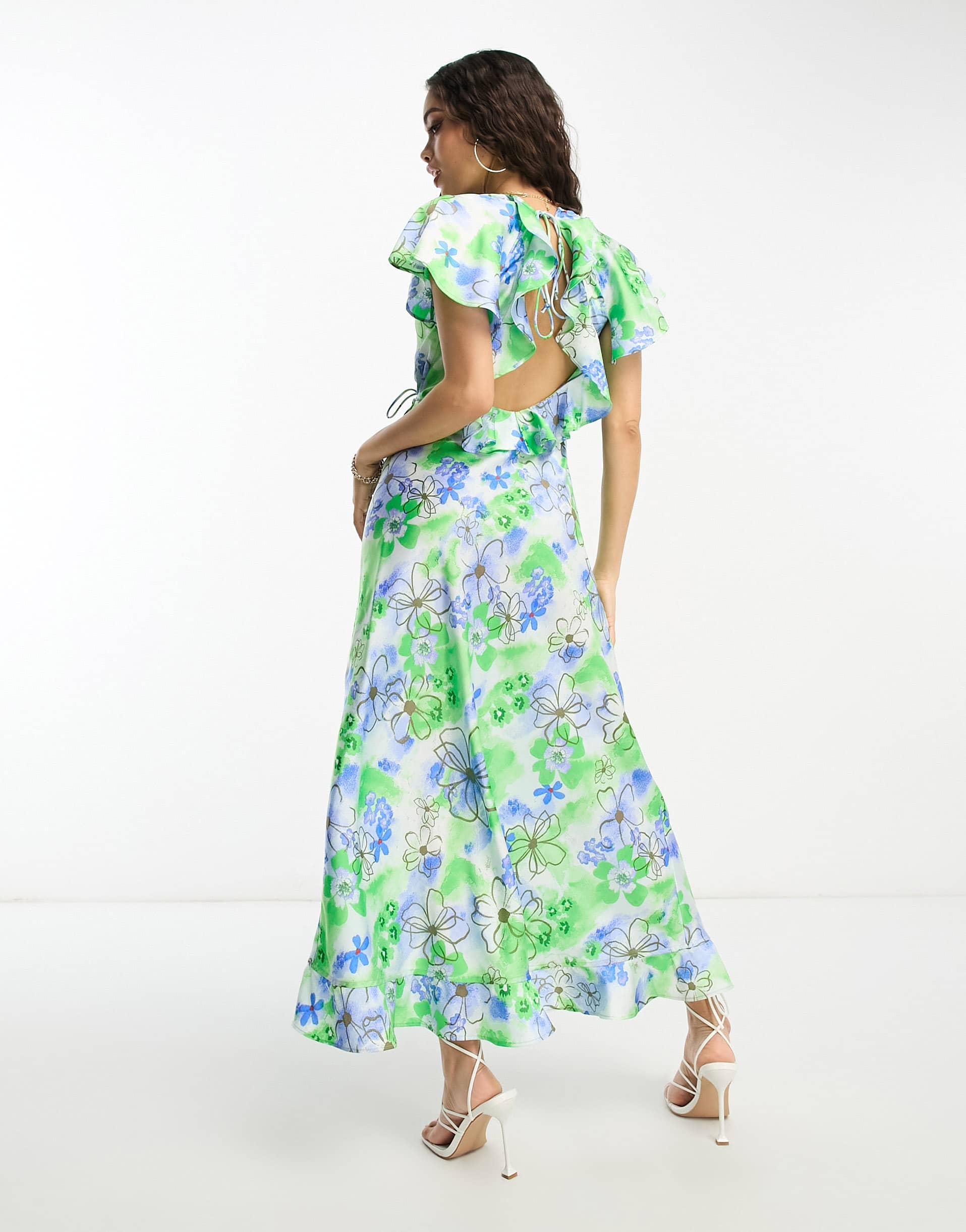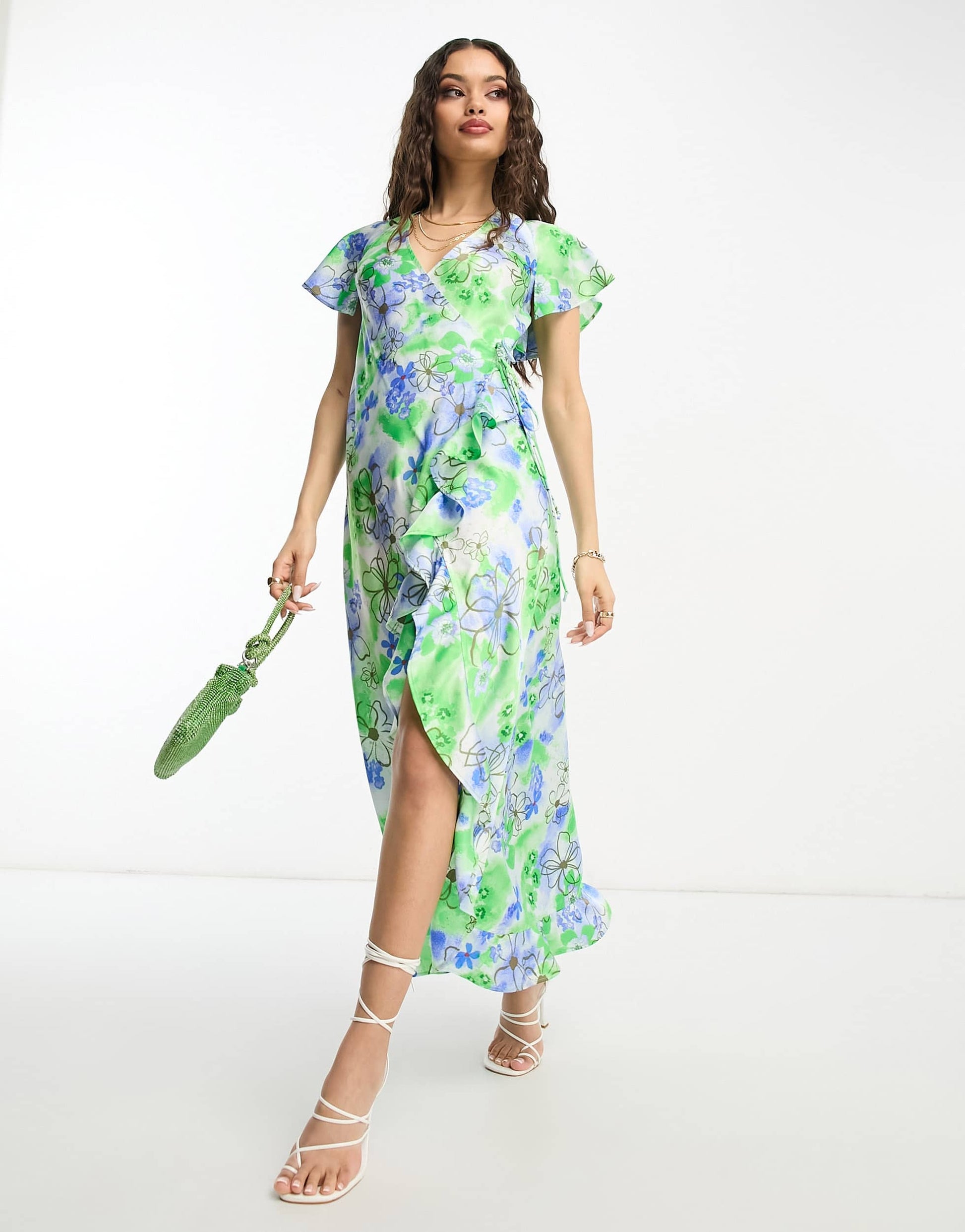 ASOS DESIGN Petite frill detail wrap maxi satin dress in white floral print