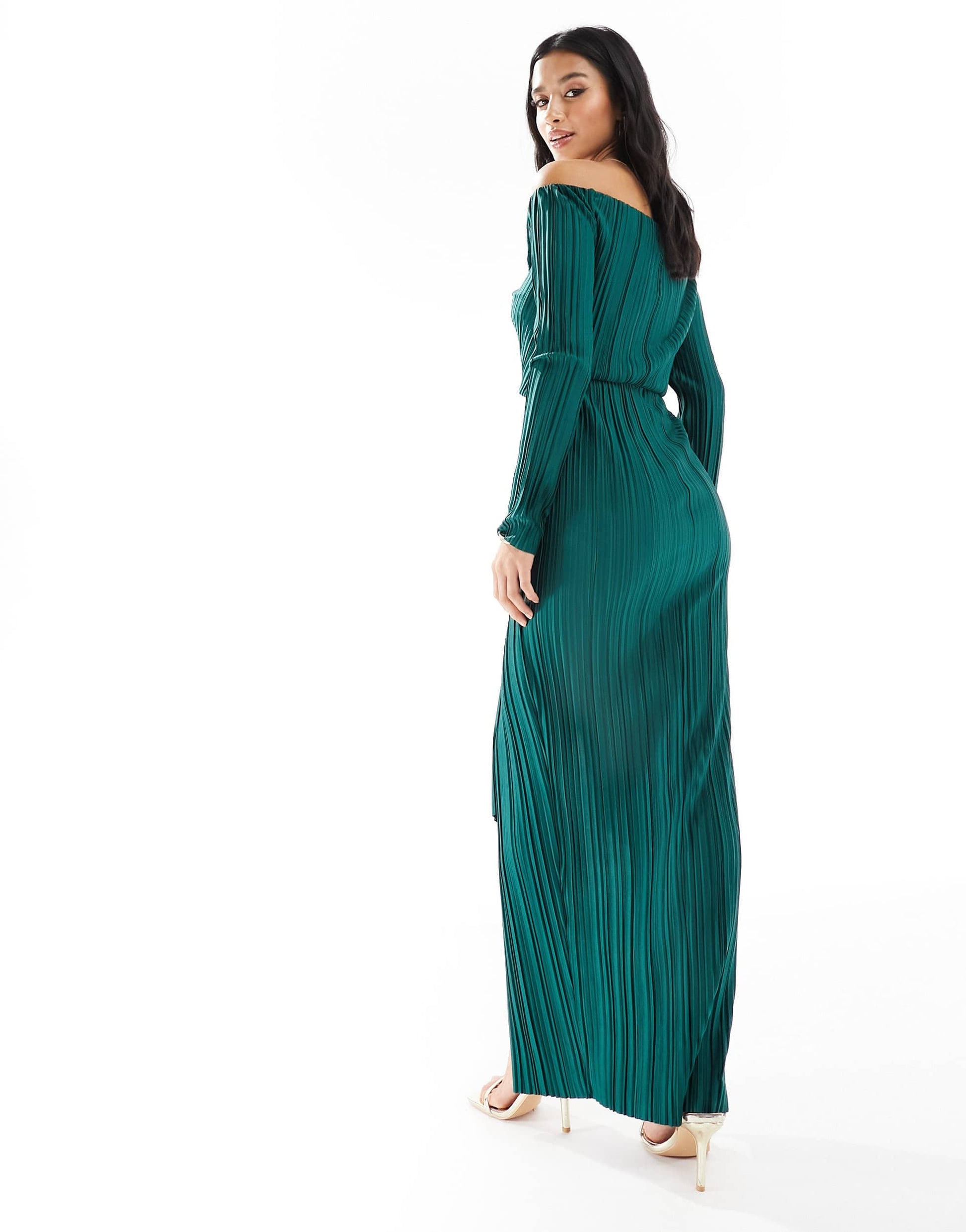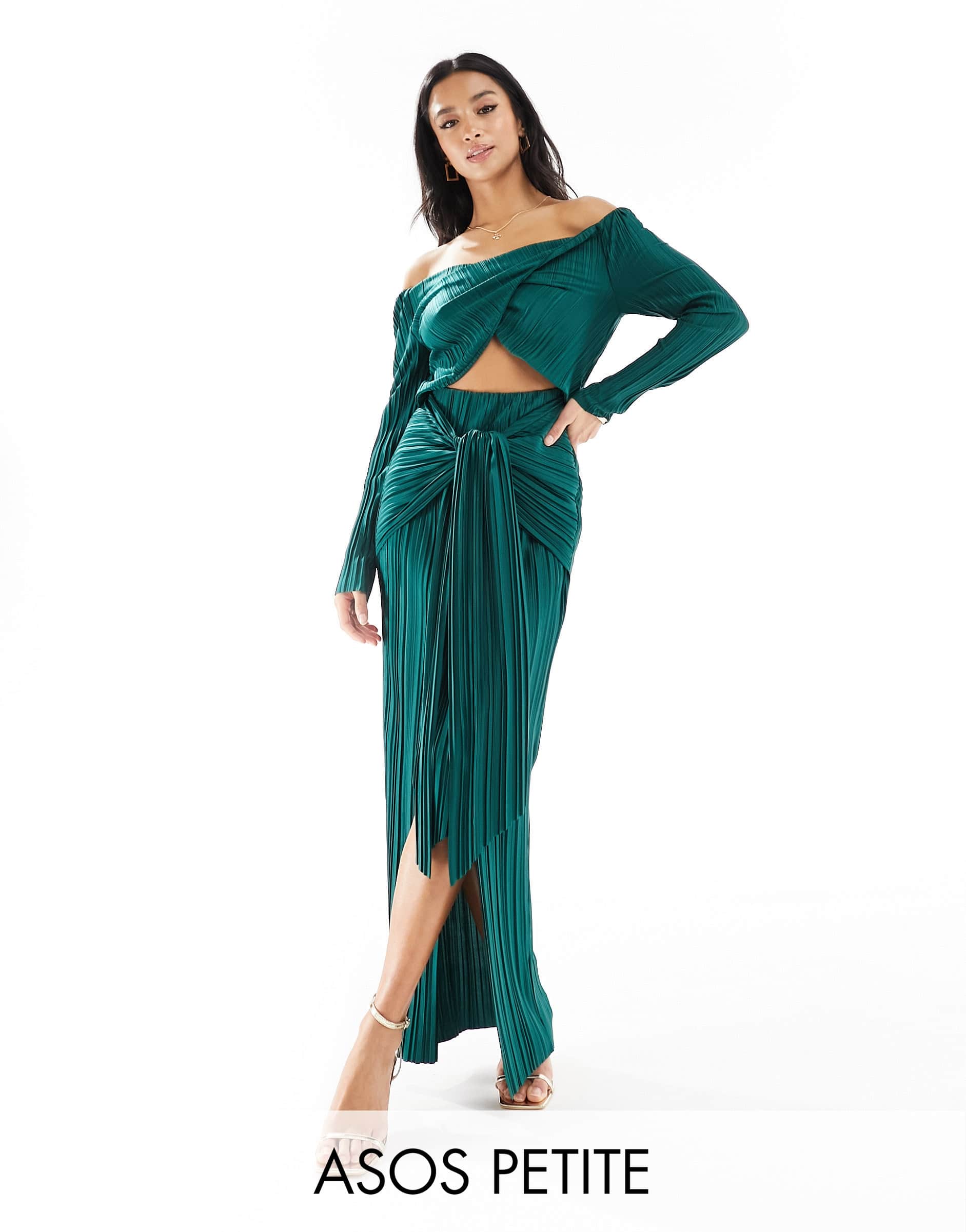 ASOS DESIGN Petite plisse bardot twist front maxi dress in bottle green