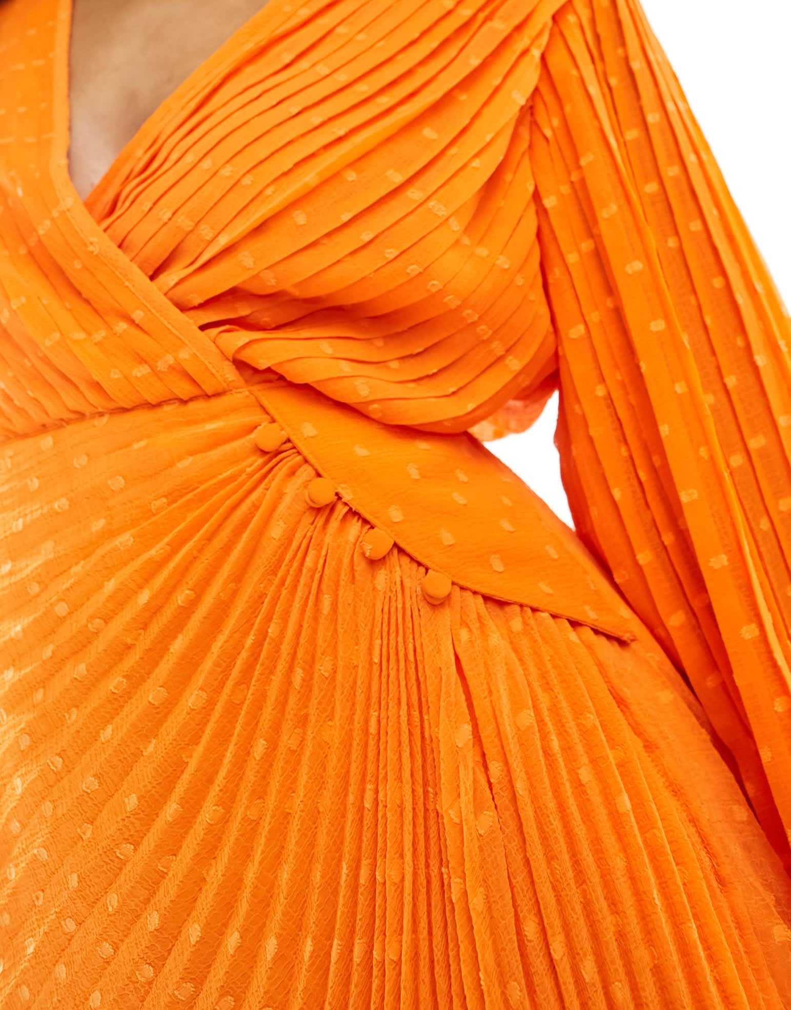 ASOS DESIGN pleated dobby chiffon wrap button detail mini dress in bright orange