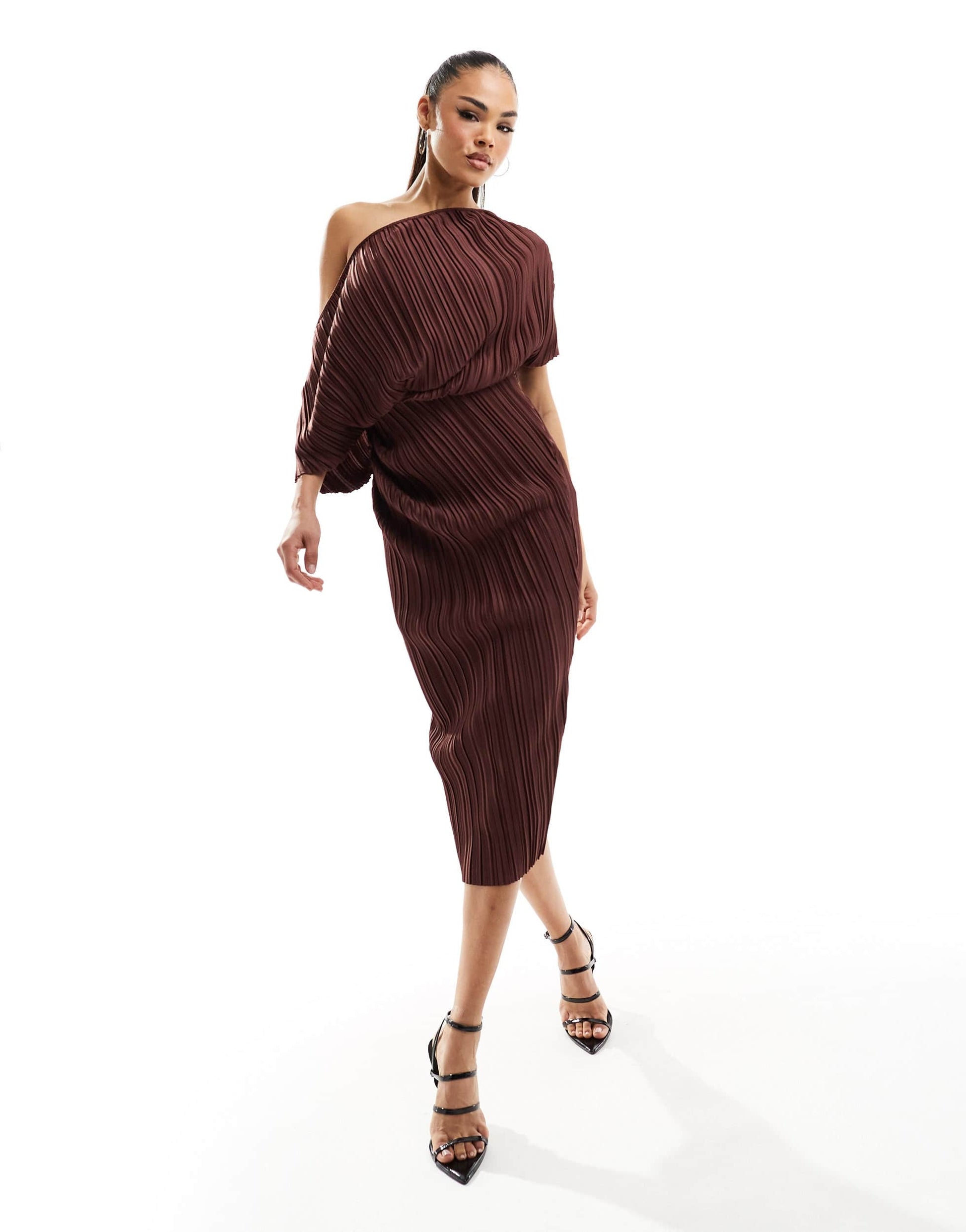 ASOS DESIGN plisse fallen shoulder midi dress in chocolate