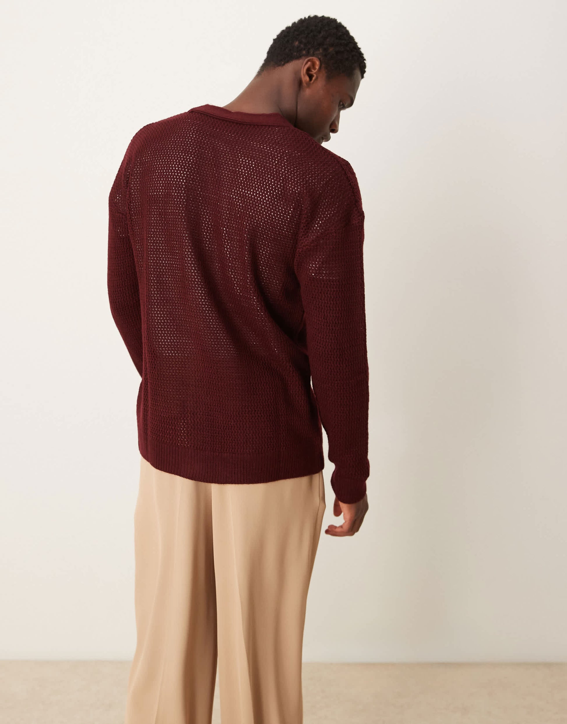 ASOS DESIGN relaxed knitted cardigan with aztec pattern in burgundy