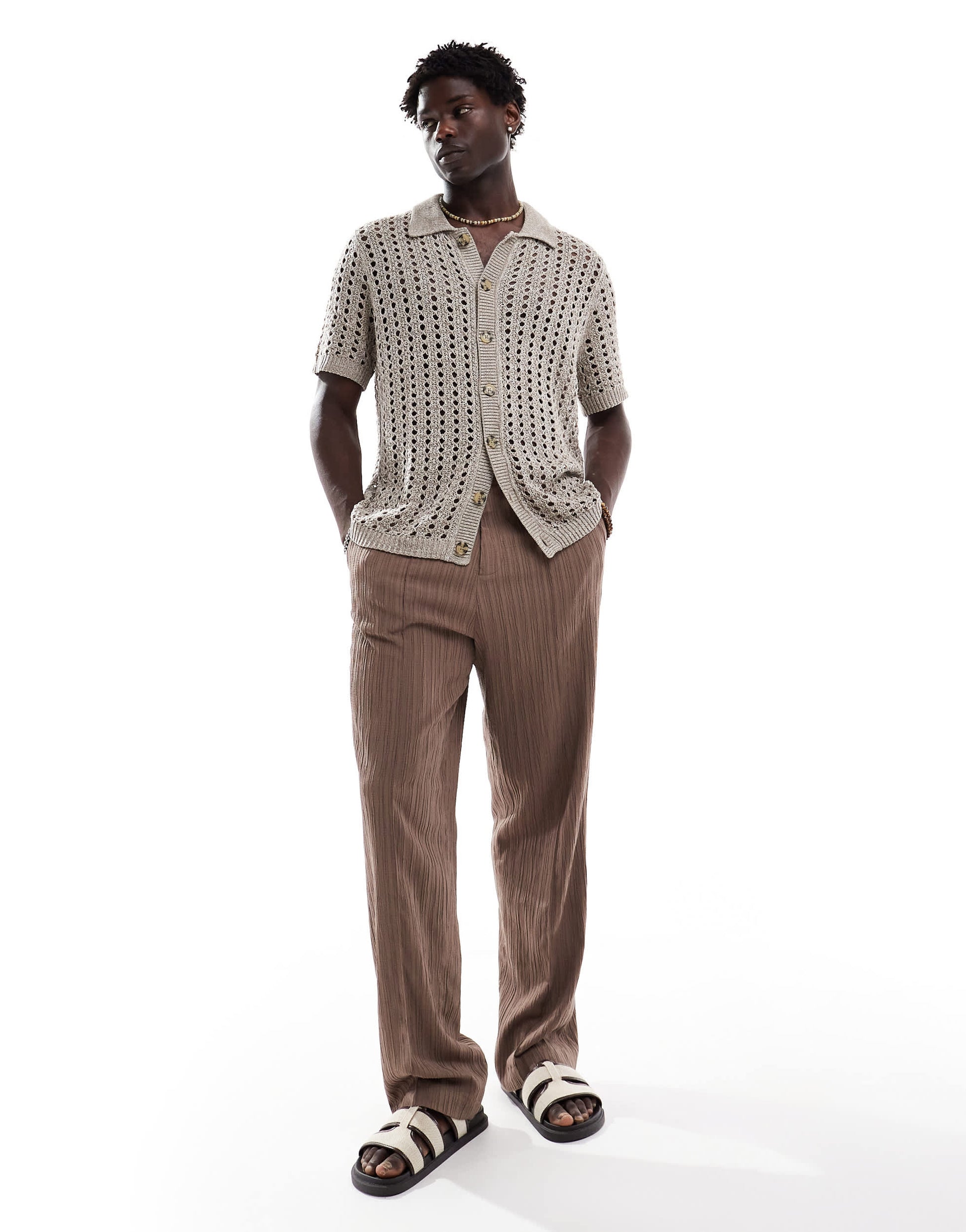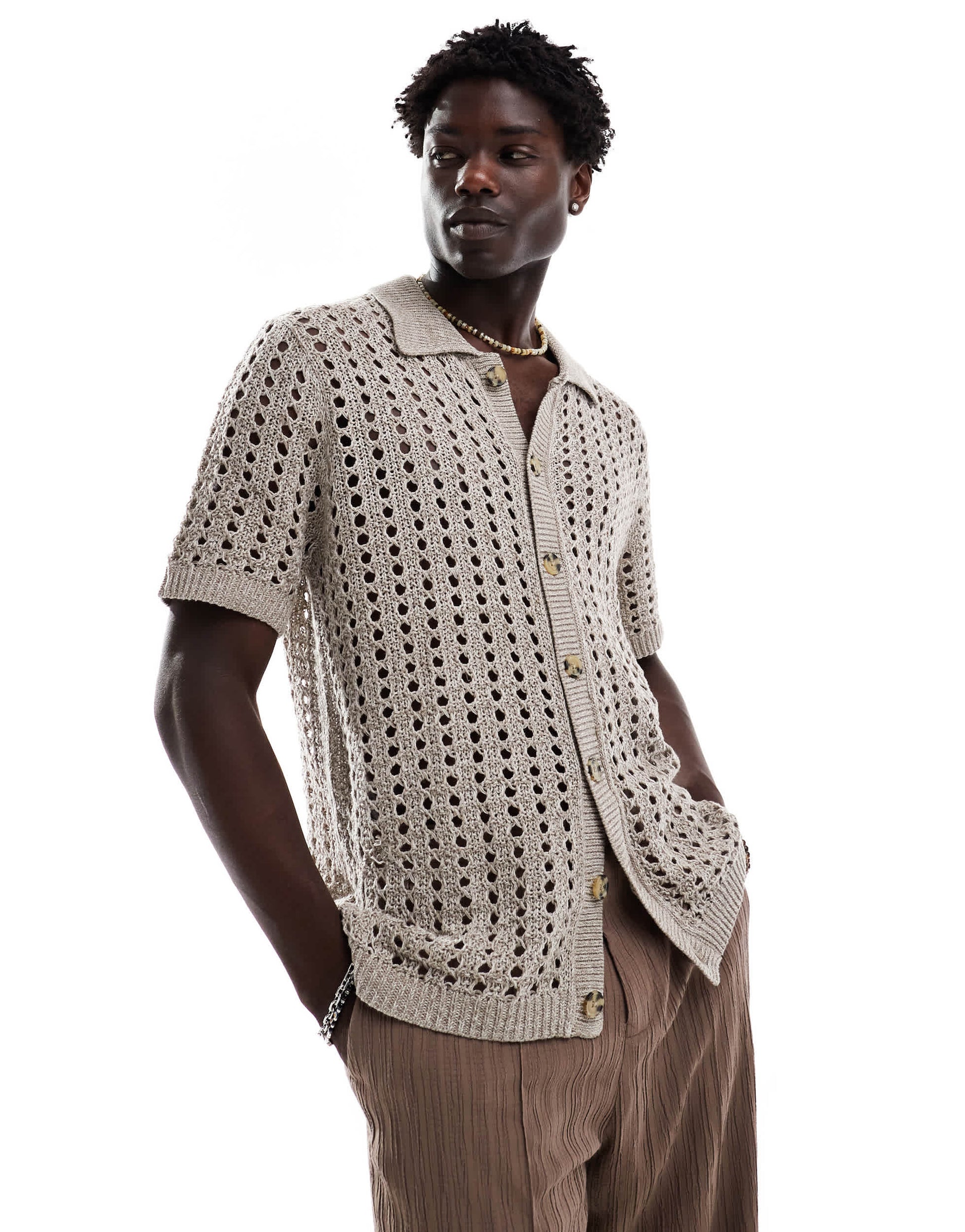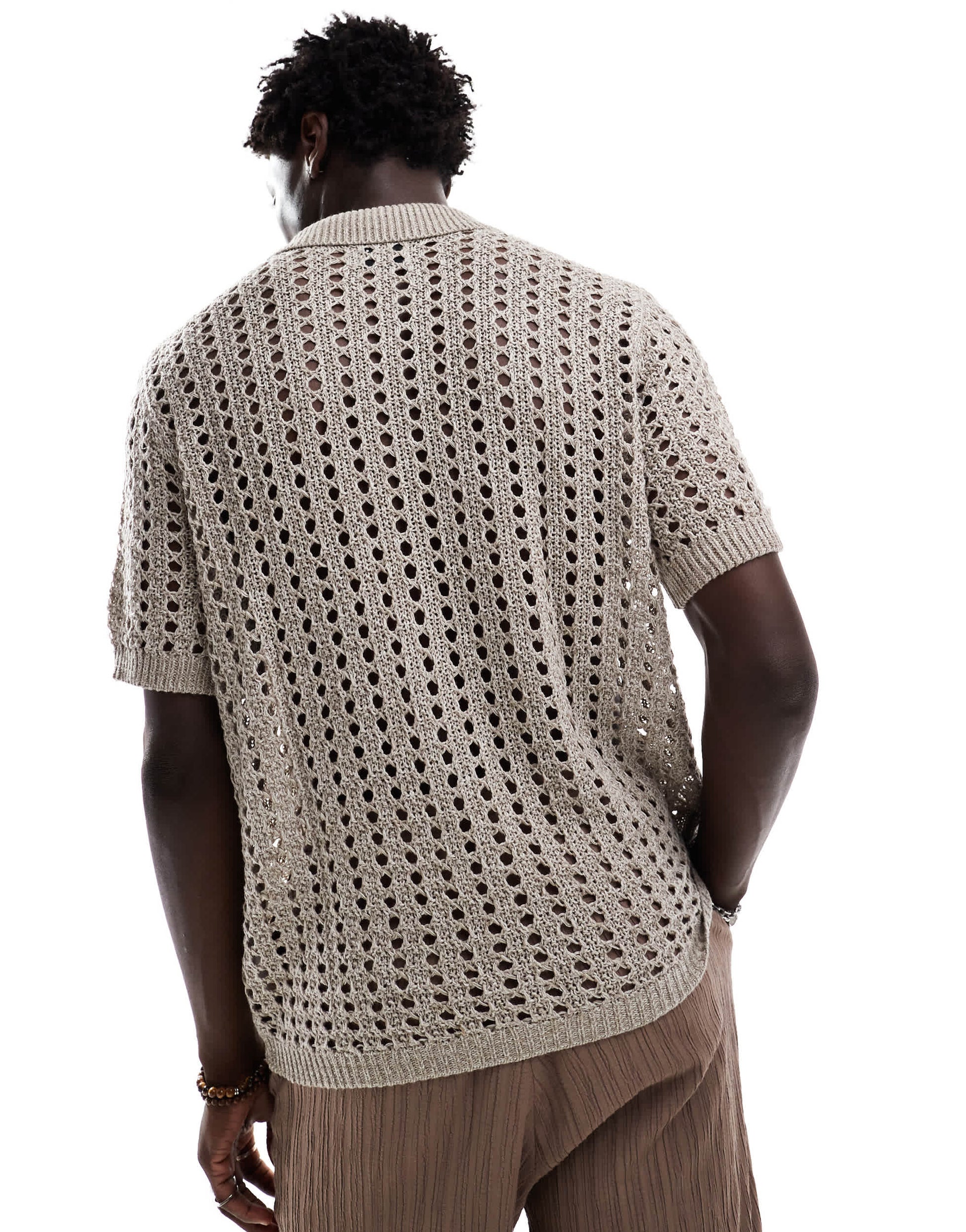 ASOS DESIGN relaxed knitted pointelle button through polo in stone