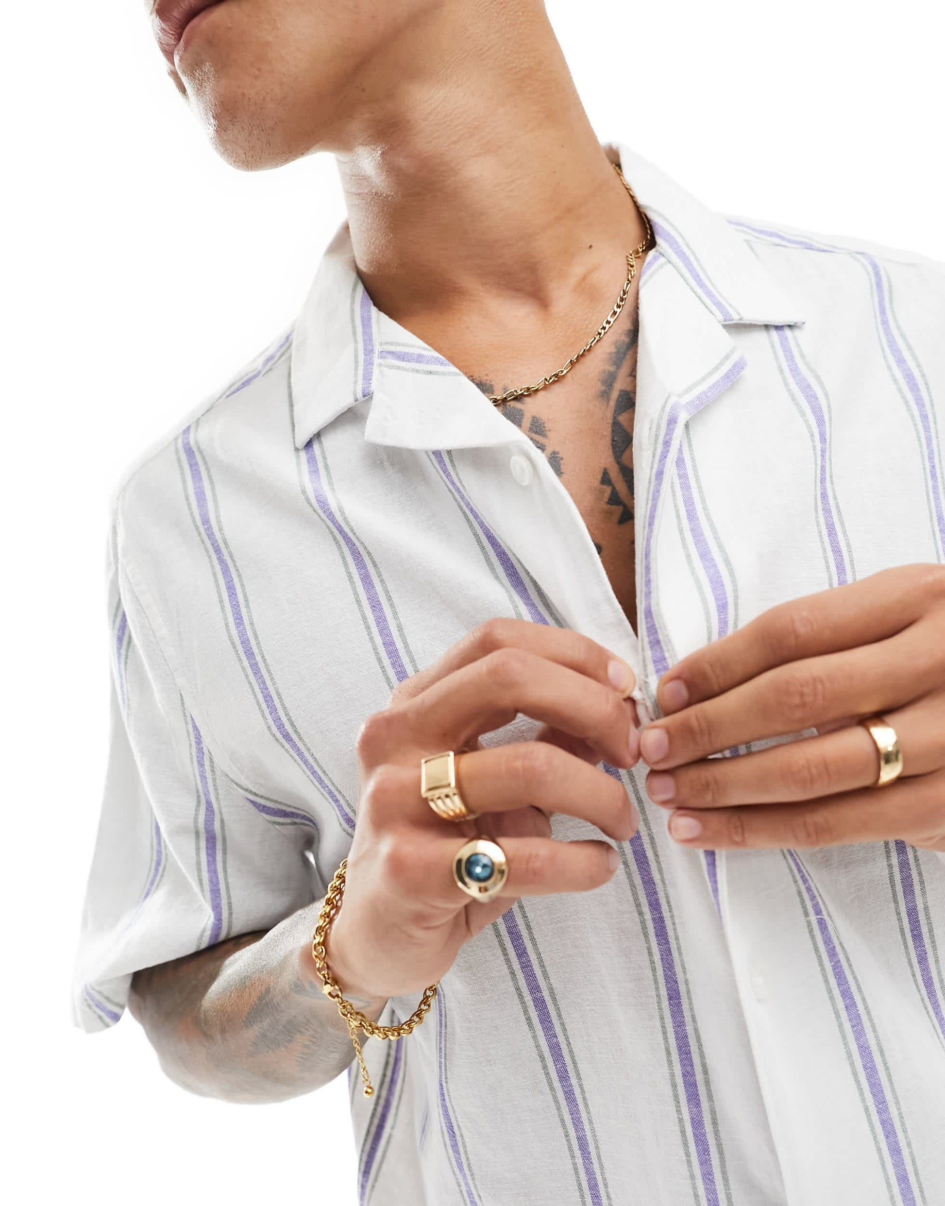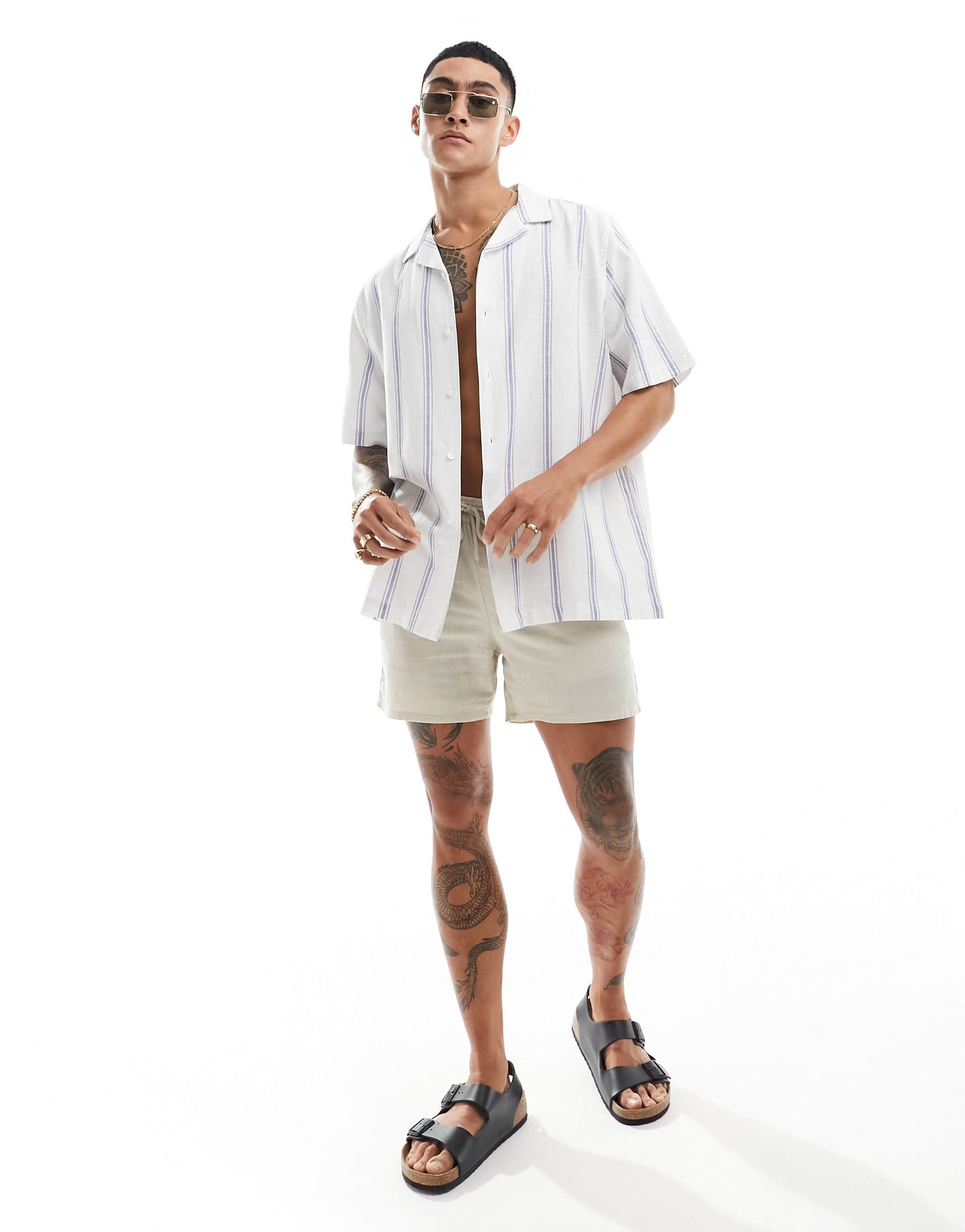 ASOS DESIGN relaxed revere shirt in linen mix stripe in blue